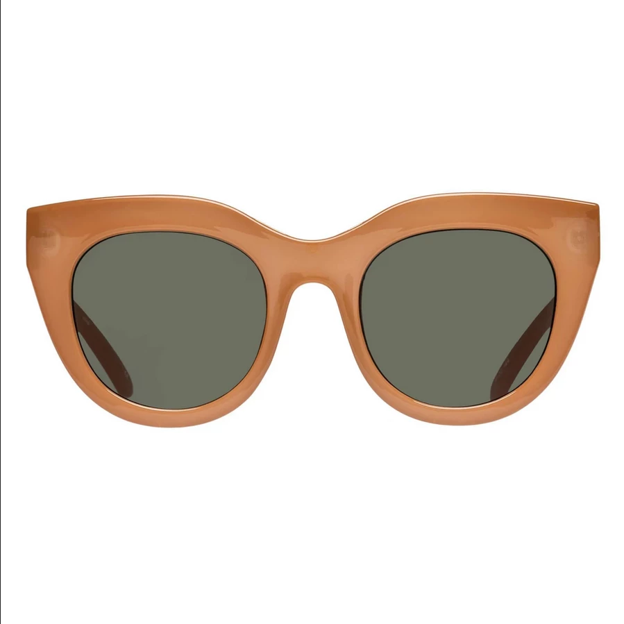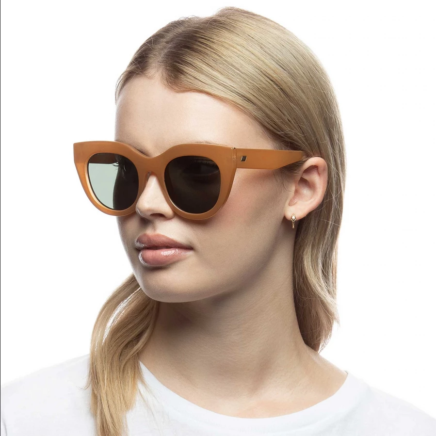 A favourite of Meghan Markle and Olivia Palermo, the Air Heart silhouette is an iconic Le Specs style. With oversized and dramatic proportions reminiscent of a cat eye, the style is designed with a thick caramel frame and luxurious metal top bar inlay, then fitted with premium zero base khaki grad flat lenses.