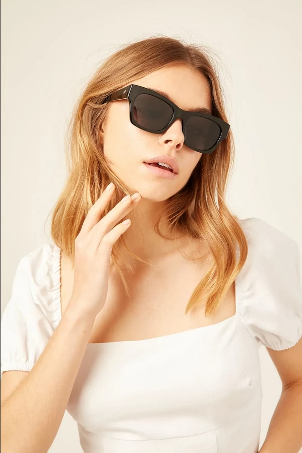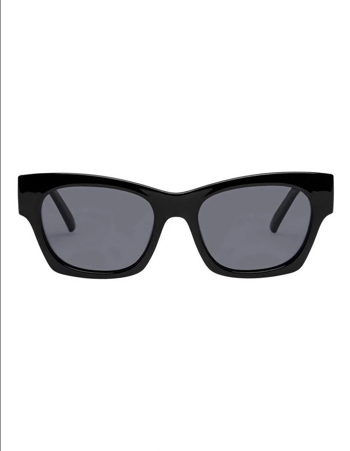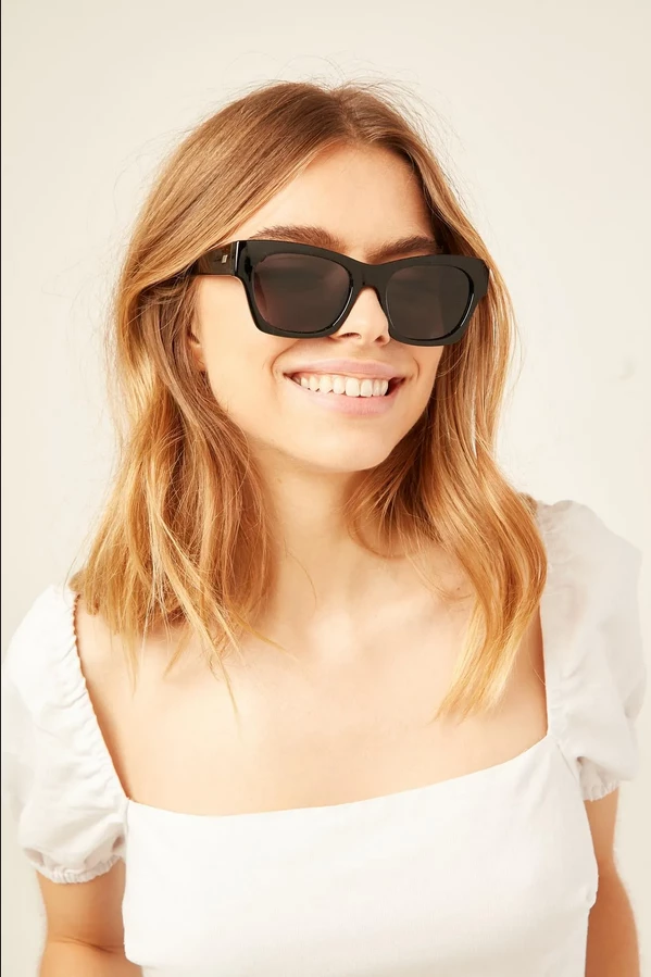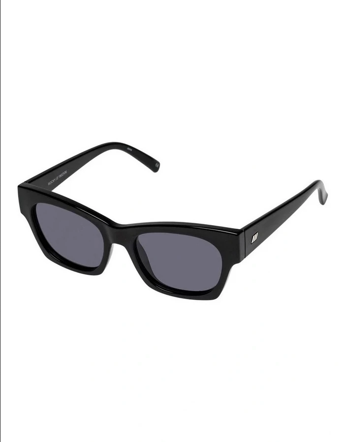 With angles reminiscent of a cat eye, Rockys rectangular silhouette offers a confident classic look designed to balance the proportions of the face. Finished with a modern flat profile and iconic Le Specs flagstripe metal hardware.