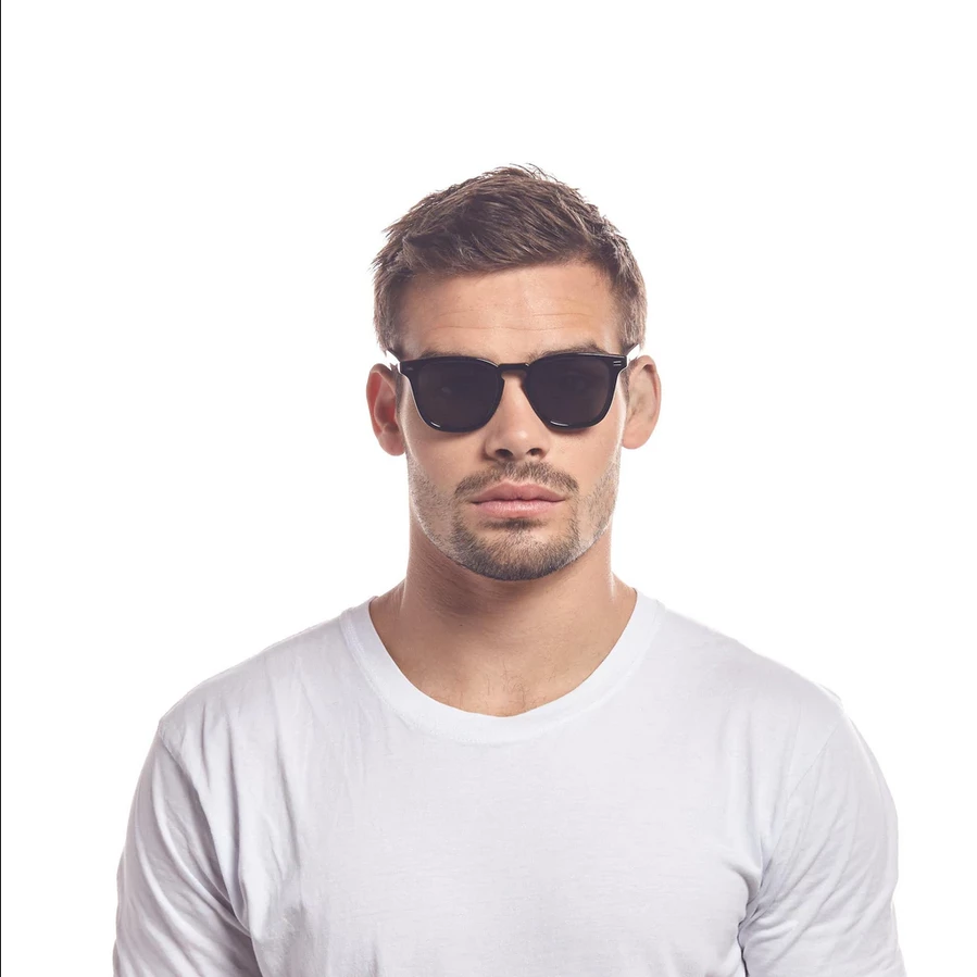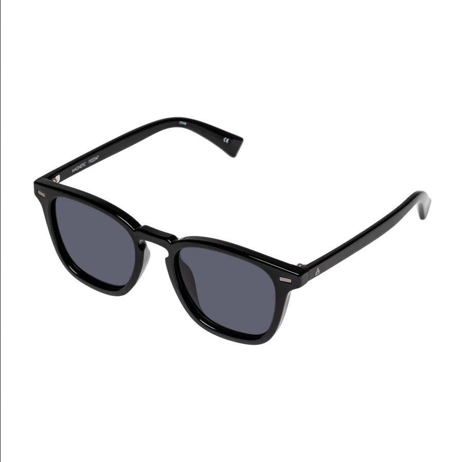 Magnetic is a squared off retro-inspired frame. Magnetic in shiny black and matching smoke lens is finished with gunmetal front decal and signature AIRE monogram temple pins.