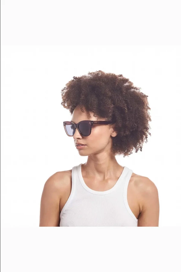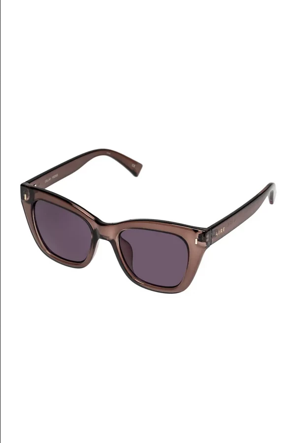 Stellar is a chunky cat eye frame and wardrobe staple. Stellar in rich mocha tones paired with smoke lens, gold rivets on front frame and signature AIRE temple foil logos.