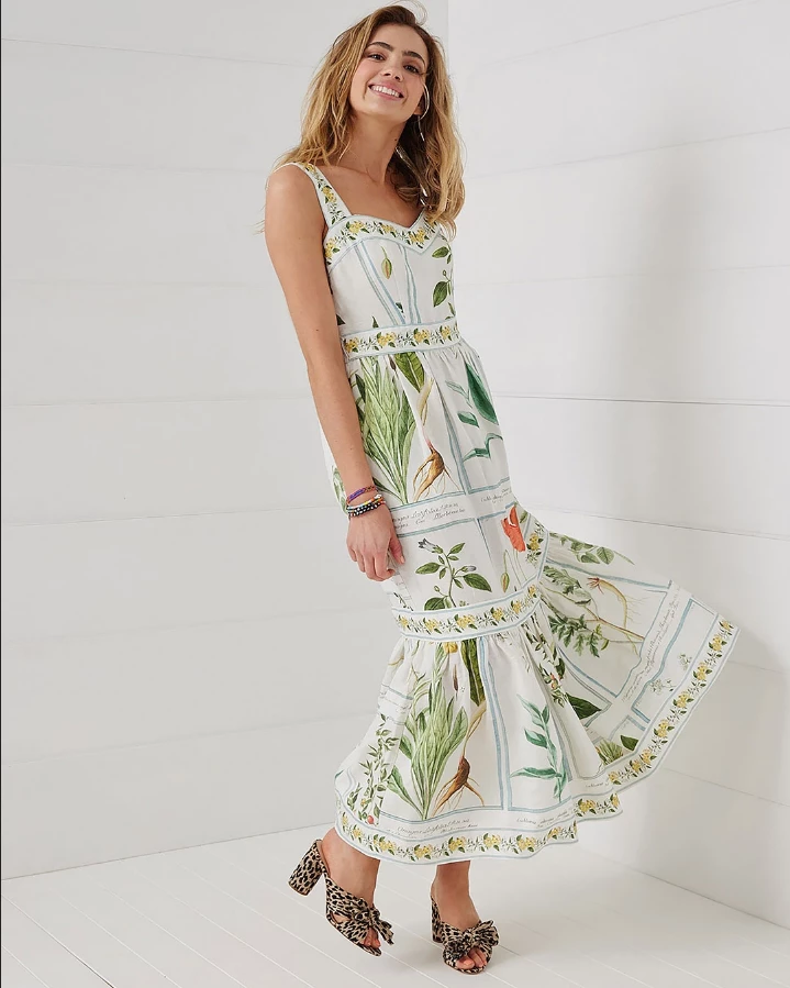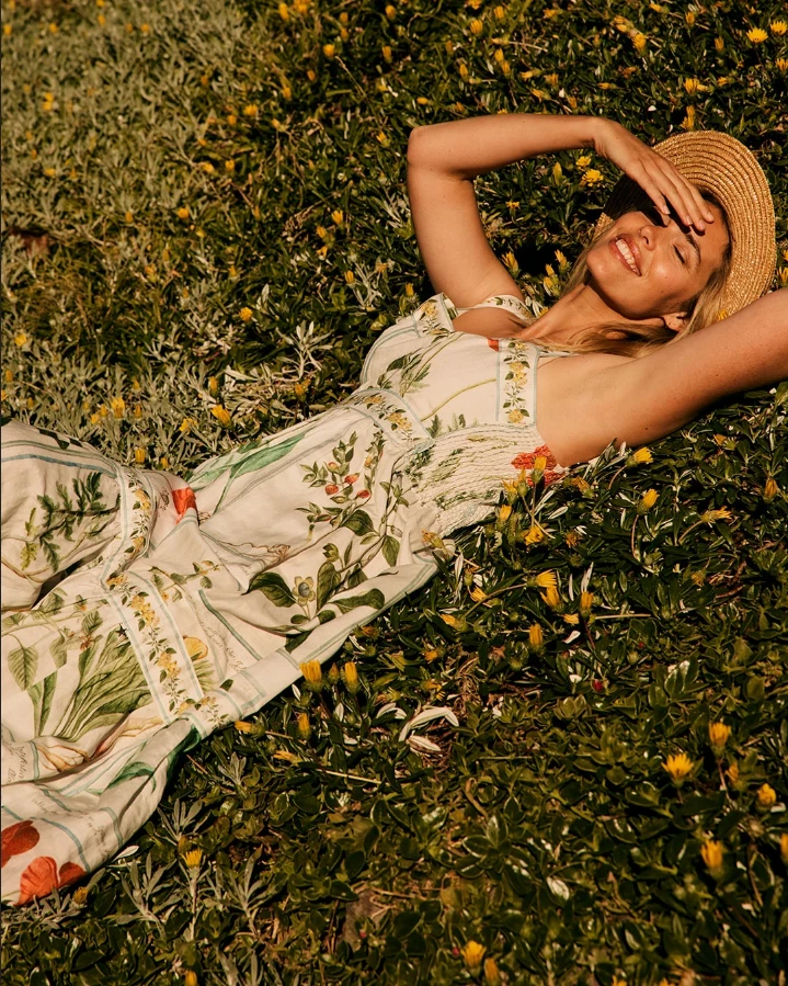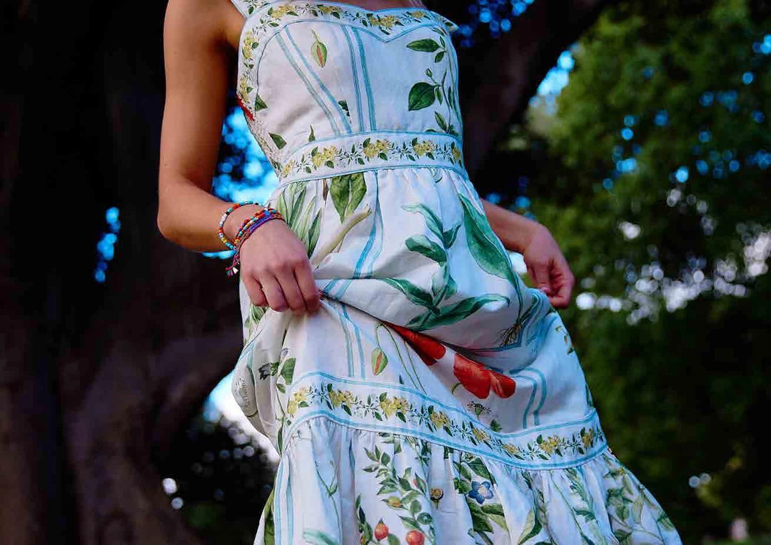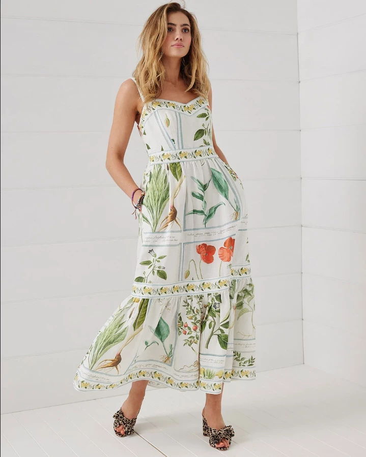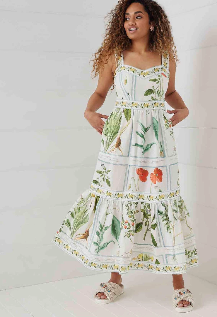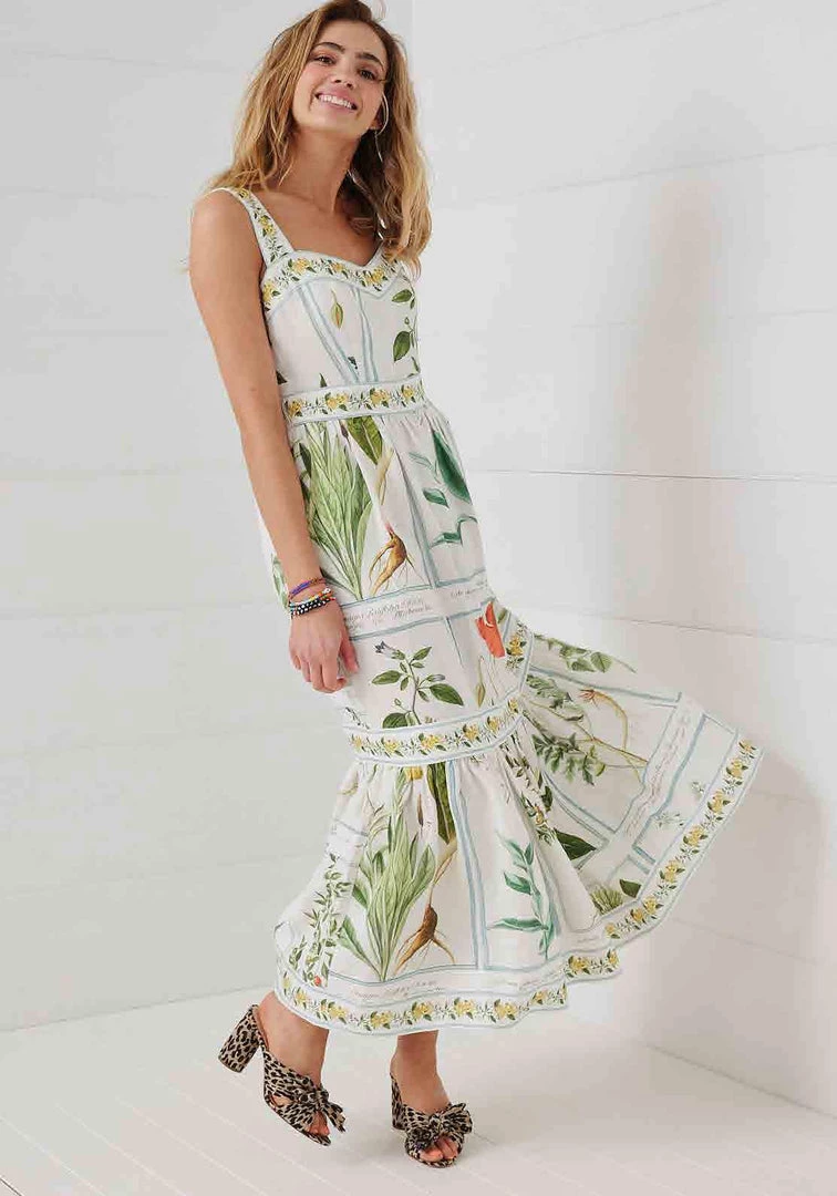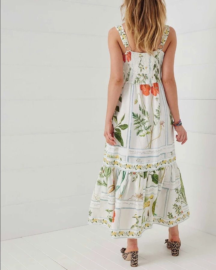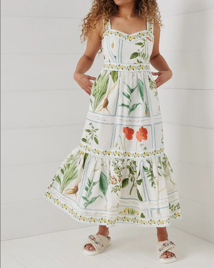 We dream of luxurious facials. Handthrown eathernware bowls of steaming scented water, fragrant mists, soothing whale sounds. Tucked into warm beds. Oh be still my beating heart. Instead we rush from the shower yelling instructions, madly spraying whatevers at hand in a mad scramble to somehow look put together enough to not be arrested for public indecency. So, in order to deliver that calming experience to you our lovely customer, we have built that experience into a sundress. Printed with Binnys 11 favourite herbs and spices, with sweetest floral border trim hem. In softest perfectly draping viscose linen.