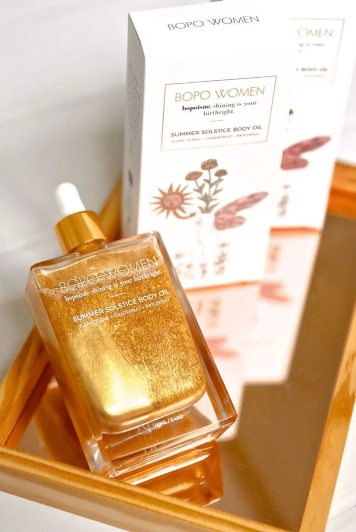Our Summer Solstice Body Oil is an all natural shimmer oil with a delicate floral perfume thanks to the beautiful Ylang Ylang, Grapefruit, Mandarin & Sweet Orange. Deeply hydrates skin while leaving a light sun-kissed glow and works well with all skin types. Can also be used in the bath. Make sure to regularly shake this product before use to get the most out of it’s glittery magic. P.s. If you like our Aphrodite perfume roller you’ll love this oil as it’s the same scent!