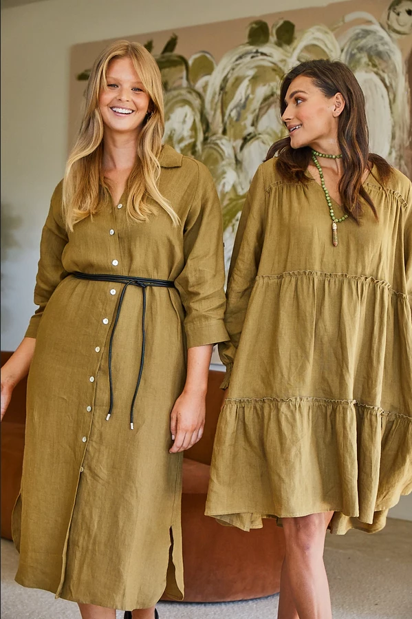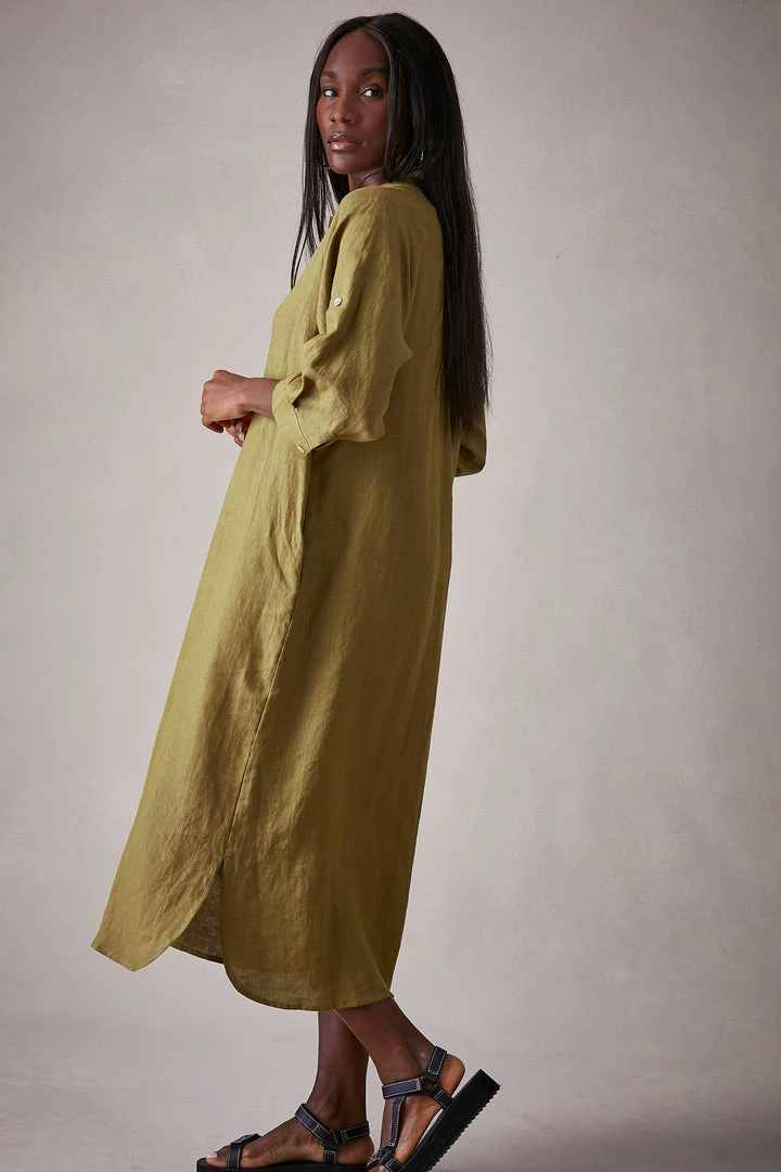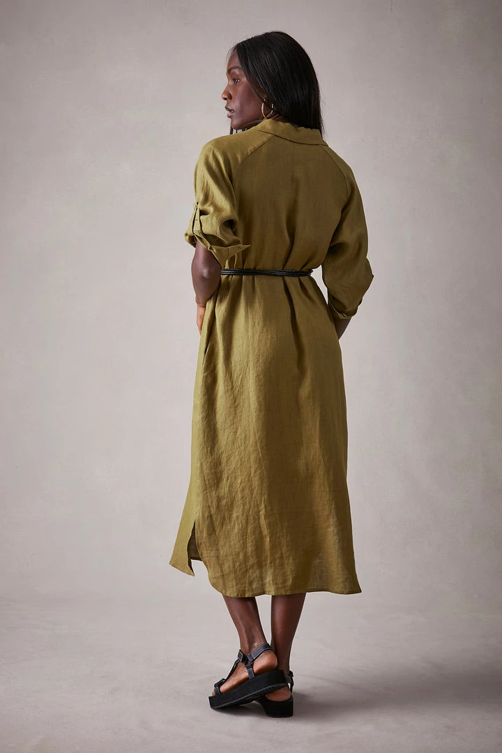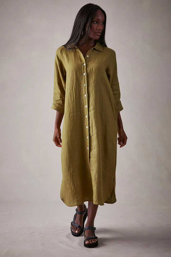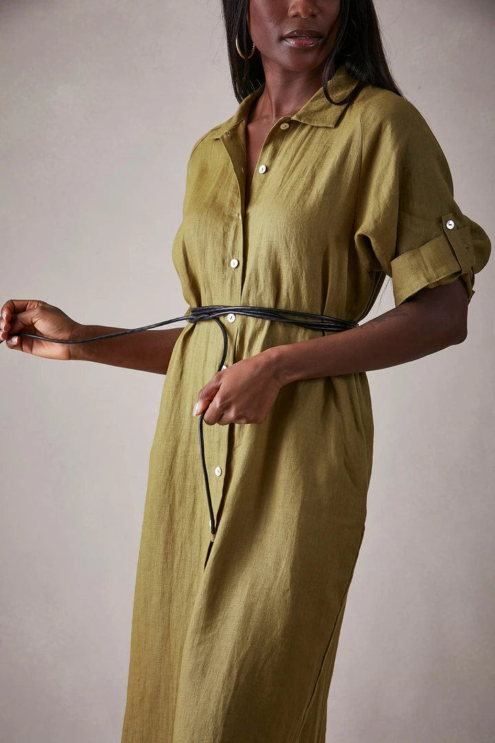 The Capella Shirt Dress captures understated elegance. Cut from 100% linen, this straight knee-length shirt dress features a collared neck, button-down front, and side pockets. Cut just below the knee; the gorgeous shirt dress has 3/4 sleeves that can be rolled up and secured with a button and tab. Wear it buttoned as a dress with the optional faux leather belt and boots for a stunning dinner look, or unbuttoned over a basic t-shirt, leggings and sneakers for a super casual vibe.
