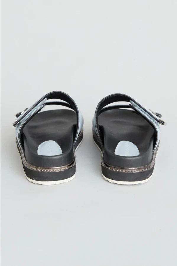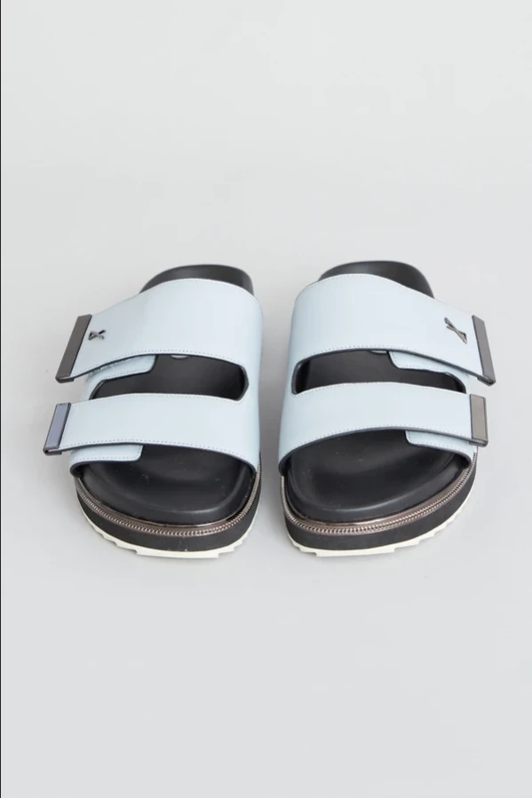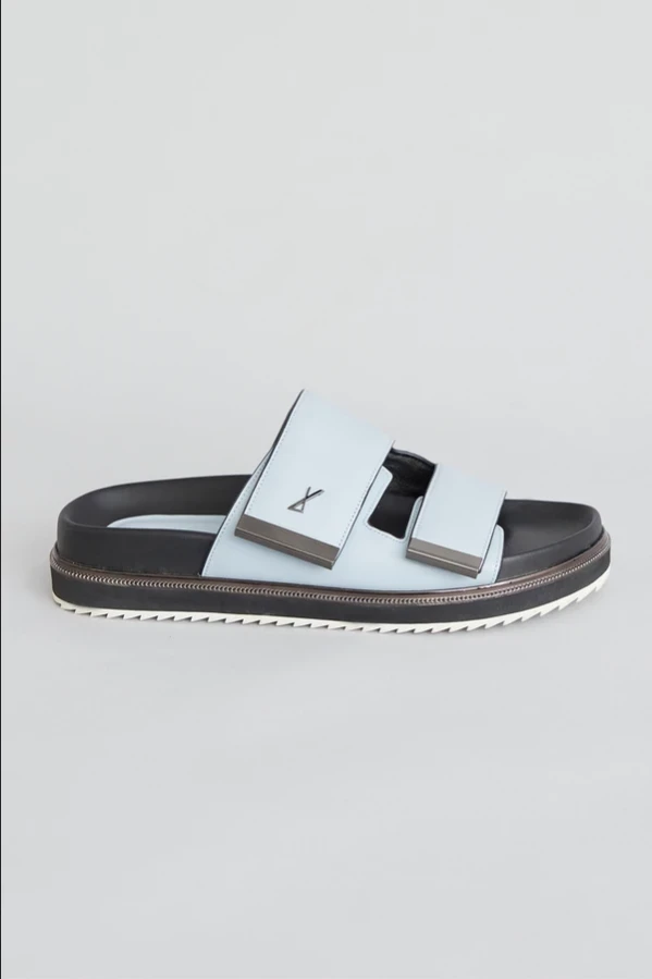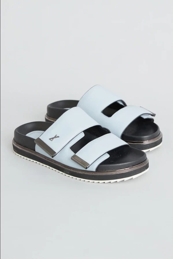 The Fortify slide, is a bold luxe double strap slide with metal accents. Featuring 2 leather straps with adjustable fastening for an easy wear.