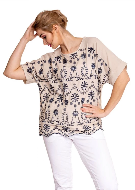This broderie anglaise top is so divine! With navy stitching featured on the front, and solid fabric on the shoulders, cuffs and rear. Perfect for jeans, shorts or a skirt – so versatile!