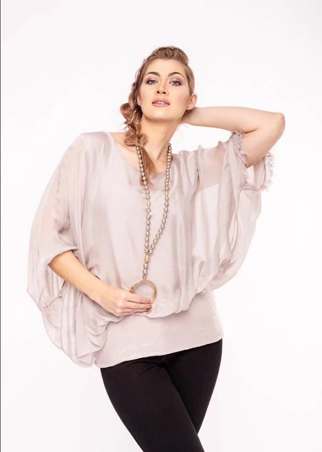 Stunningly different silk overlay top with sensational sequin band around the whole garment’s hemline. Topped off with frayed sleeve ends.