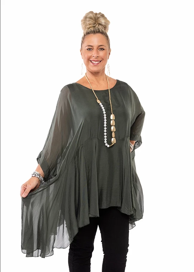 Another gorgeous silk top that will look fabulous on many sizes. The silk cascades to long back hemline. Comes with a viscose cami.