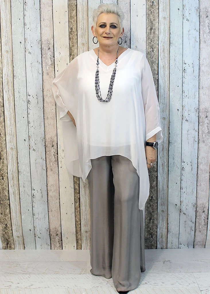 The Gia pant is a long romantic flowing pant with a mid-calve slit up the outer leg. It is made from delicate, Italian silk. The wrap waistband is elasticized and stays flat to offer a lovely figure-flattering shape. You no longer do you need to sacrifice comfort for style!