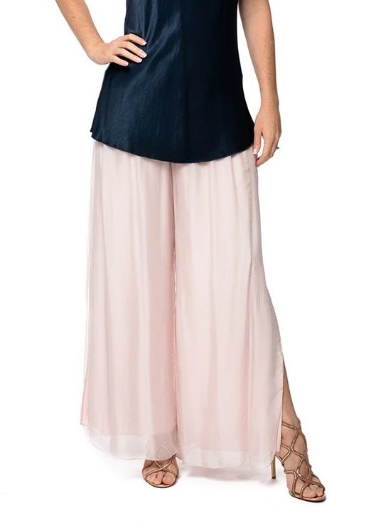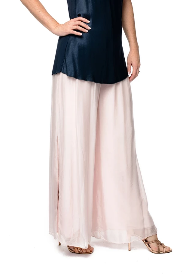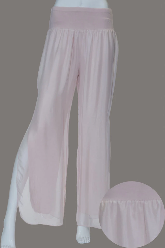Our beautiful silk romantic free flowing pants with slit up the outer leg. Stretch waistband and fully lined. Pant outer 100% silk.