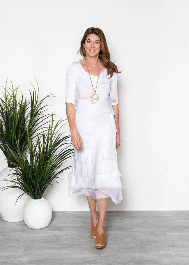 Our gorgeous silk layered dress with a mid length sleeve.