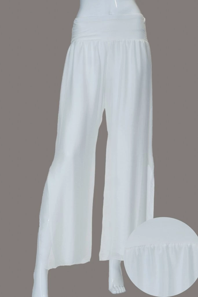 Our beautiful silk romantic free flowing pants with slit up the outer leg. Stretch waistband and fully lined. Pant outer 100% silk.