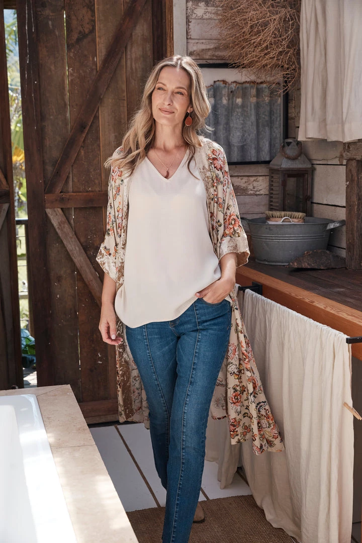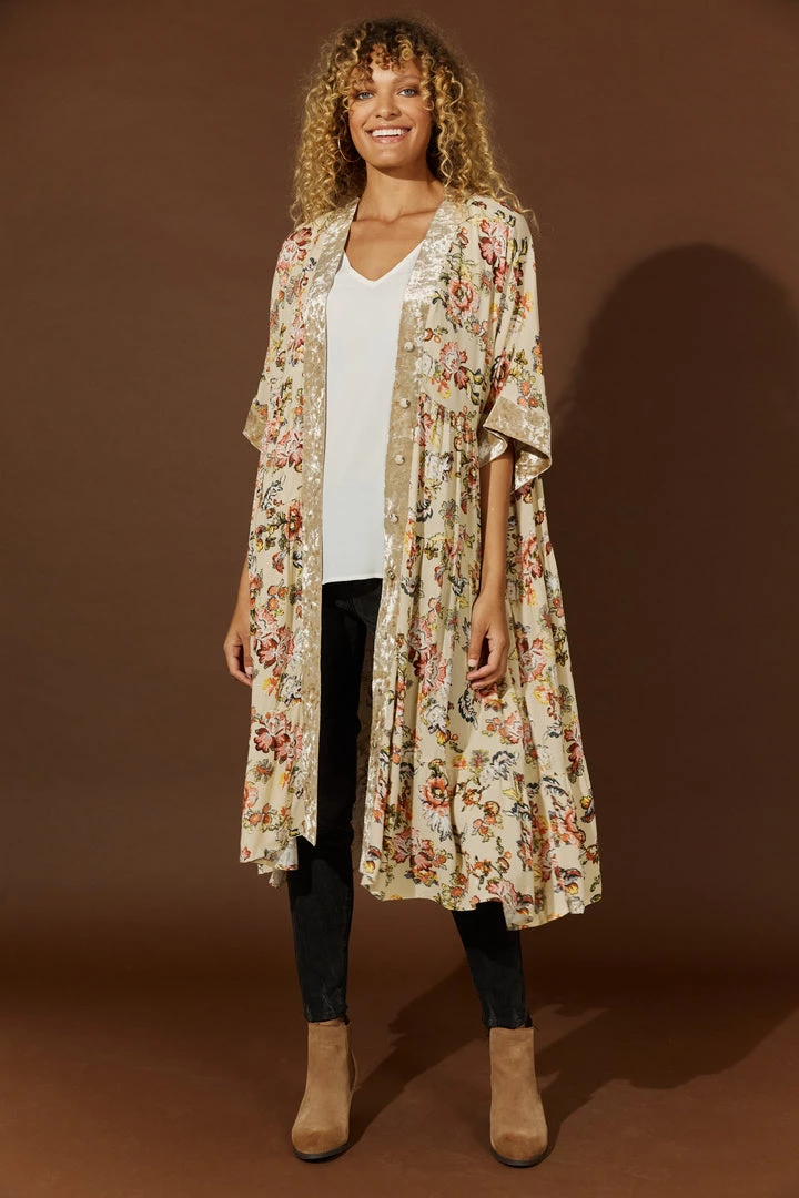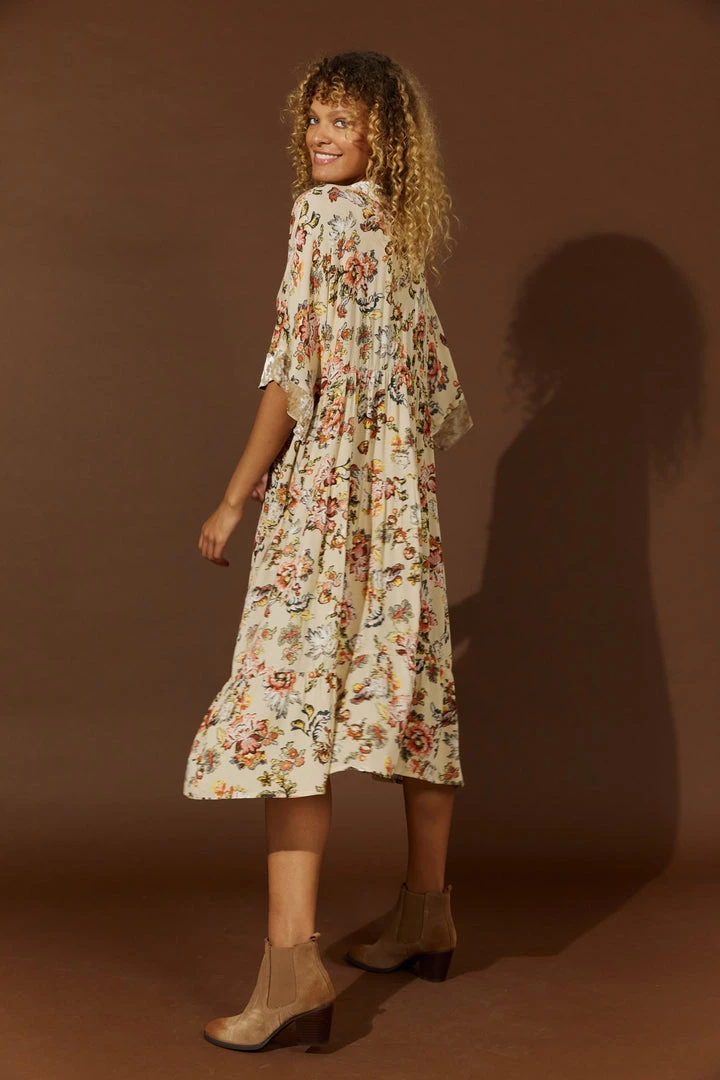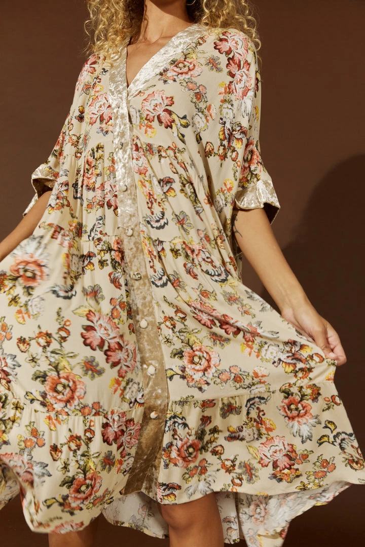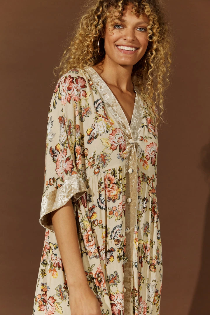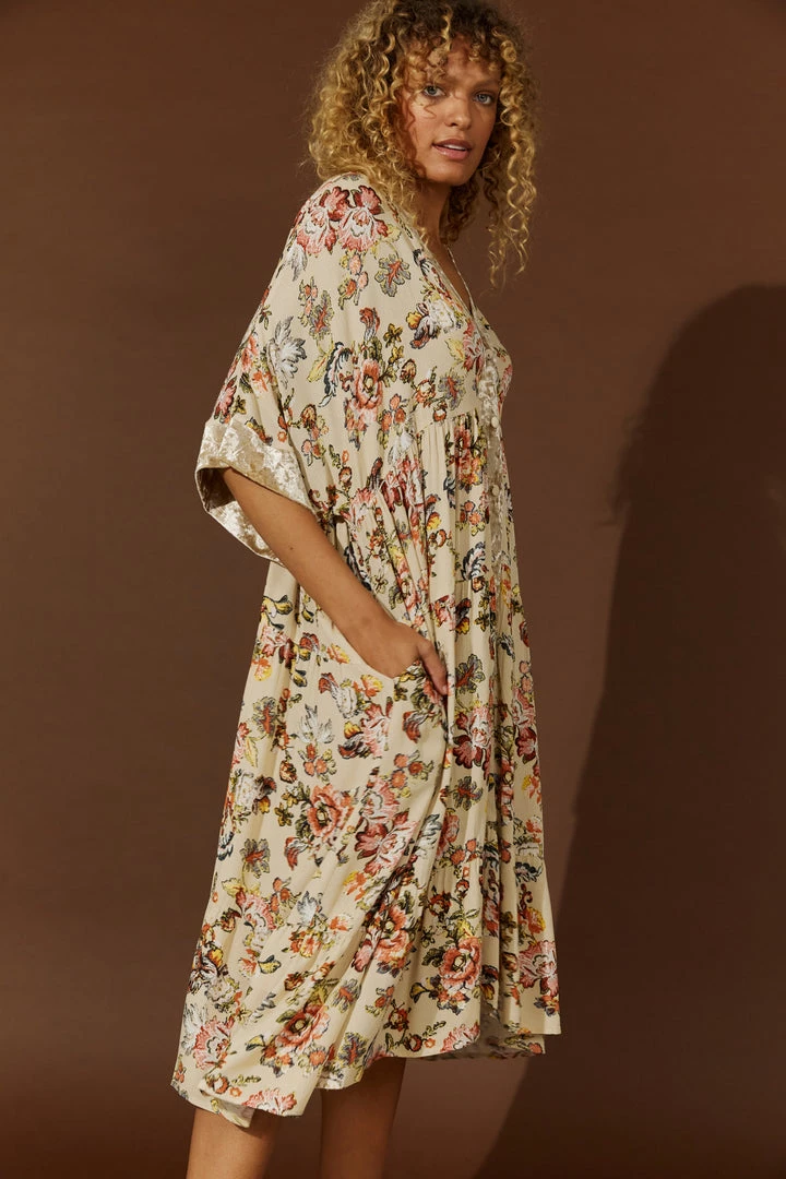 Make room in your winter wardrobe for the beautiful Habitual Dress/Cape. Simple and versatile, this one-size design can be worn as a dress or a cape. Made with 100% viscose, this knee-length design features a V-neckline, a button-down front and elbow-length sleeves. A crushed velvet contrast offset against the beautiful floral patterning creates a lovely finish.