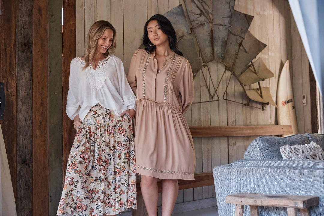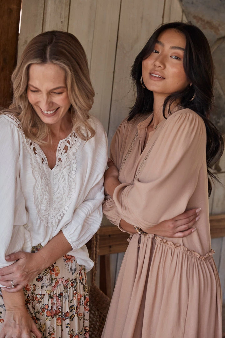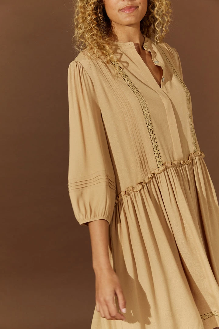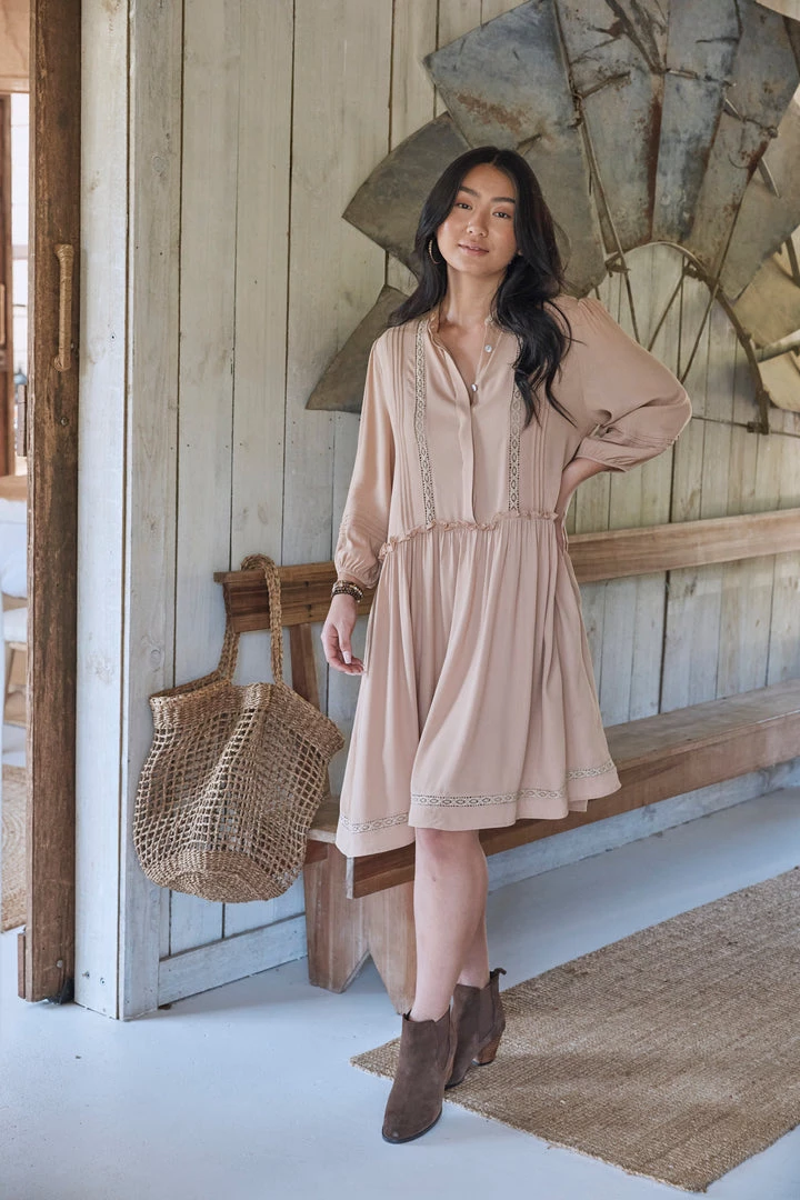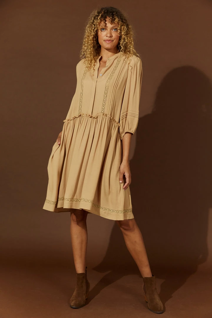 Dress up or down with the Prosper Dress. This beautiful piece has been made with viscose, creating a soft, silk-like finish. Designed with a collarless V-neckline and a half button detail, this stunning knee-length dress features 3/4 balloon sleeves, side pockets and a frilled gathering along the waist. An embroidered contrast and pintuck detail along the bodice, sleeves and hemline add a lovely finish to the design.