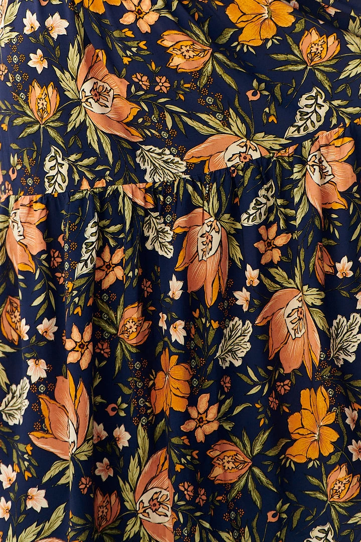 The Navy California Poppy Print Nevada Dress is the cutest midi dress this season! This gorgeous midi features an elasticated ruched waist with 3/4 bell cuff sleeves, we love how flattering this piece is!