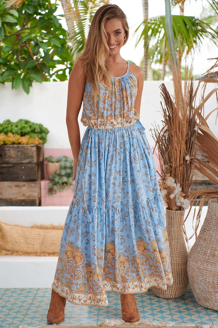 Exclusive Australian designed print this feminine beauty features a high neck line with back adjustable tie, thin shoulder straps, pockets and all importantant elasticated waist making the Sorrento a great easy flattering fit on all body types.