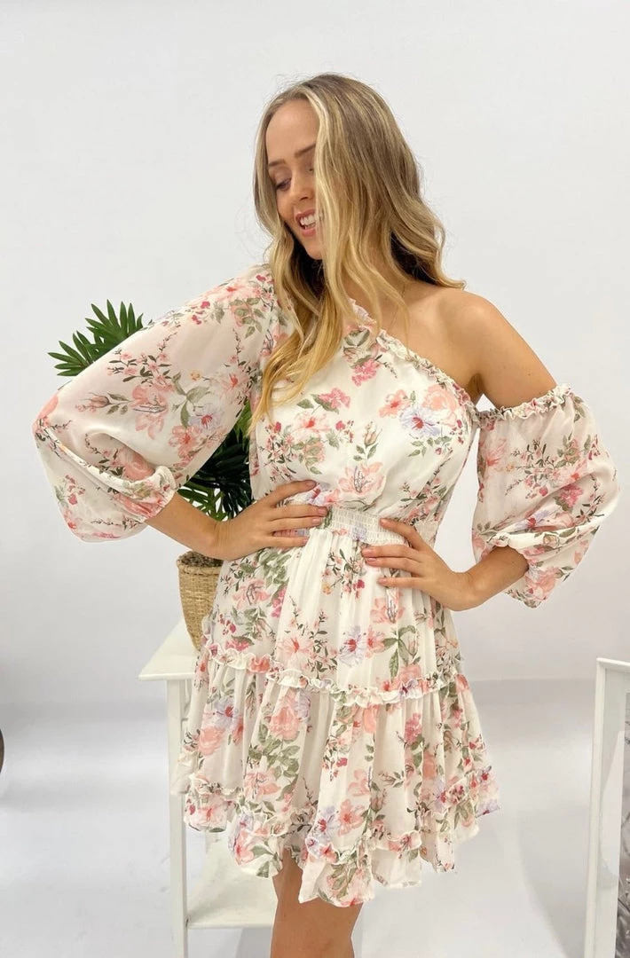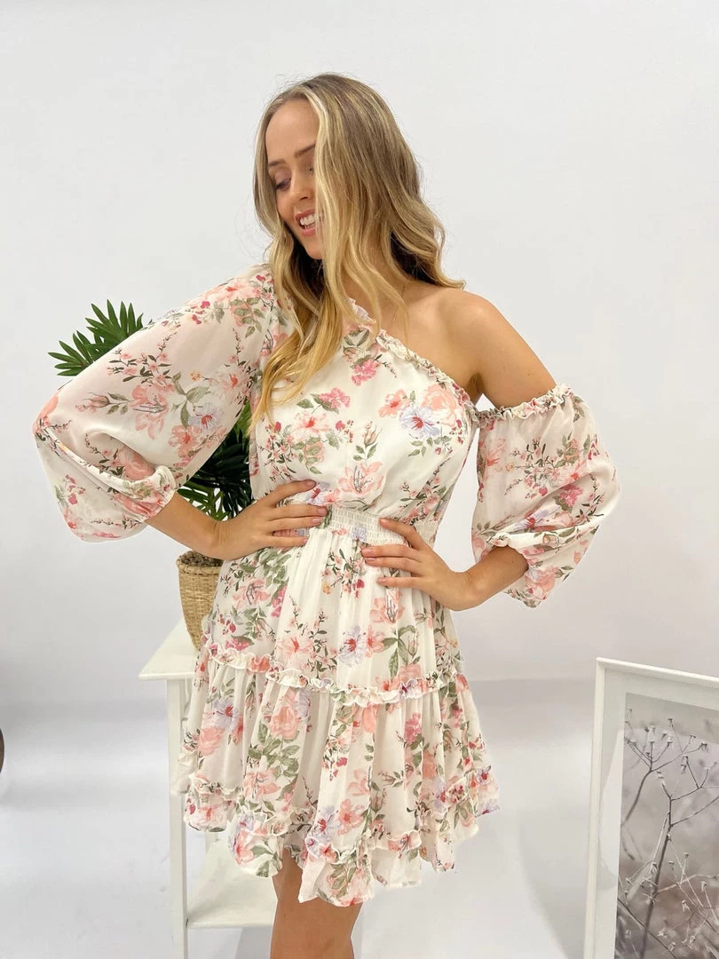 Lorraine – Lily One Shoulder Mini Dress – Cream 34302