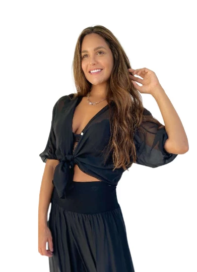 Grace Button Top shown tied in the Black or worn open in White very versatile style that can be worn in different ways.