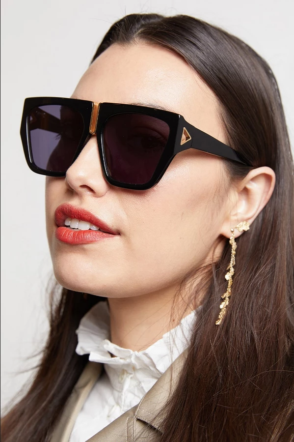 Crafted in glossy black bio-acetate, the Double Trouble’s oversized frame is rendered with dramatic angular lenses for an ultra-modern look. The sleek black is accented with polished gold metal split at the bridge and triangle cut-out referencing the iconic Karen Walker arrowhead. A great staple for any wardrobe, they’ll quickly become your go-to pair.