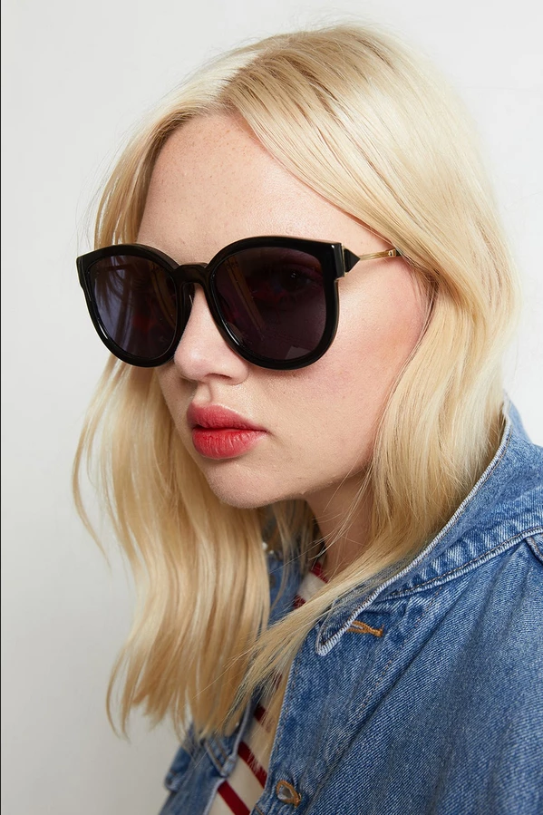 One of the most loved Karen Walker silhouettes, the ‘Super Duper Strength’ has been refreshed and further refined in sleek all black acetate with gold tone metal temples. The black triangle inlay is a subtle nod to the original KW arrow hardware