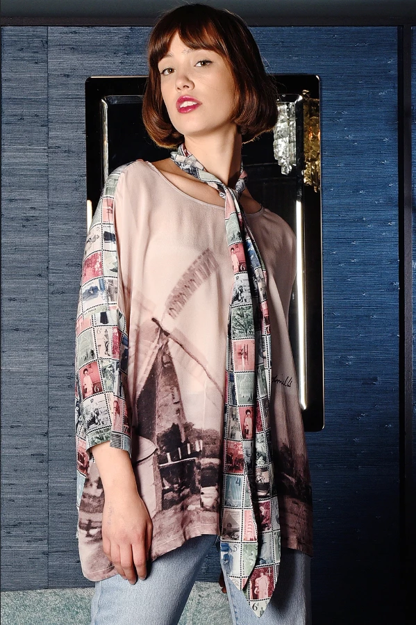 Vintage stamp print on back and sleeves with faded vintage windmill photo print and text on front.