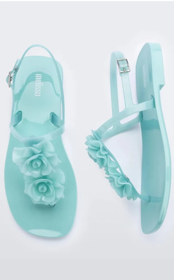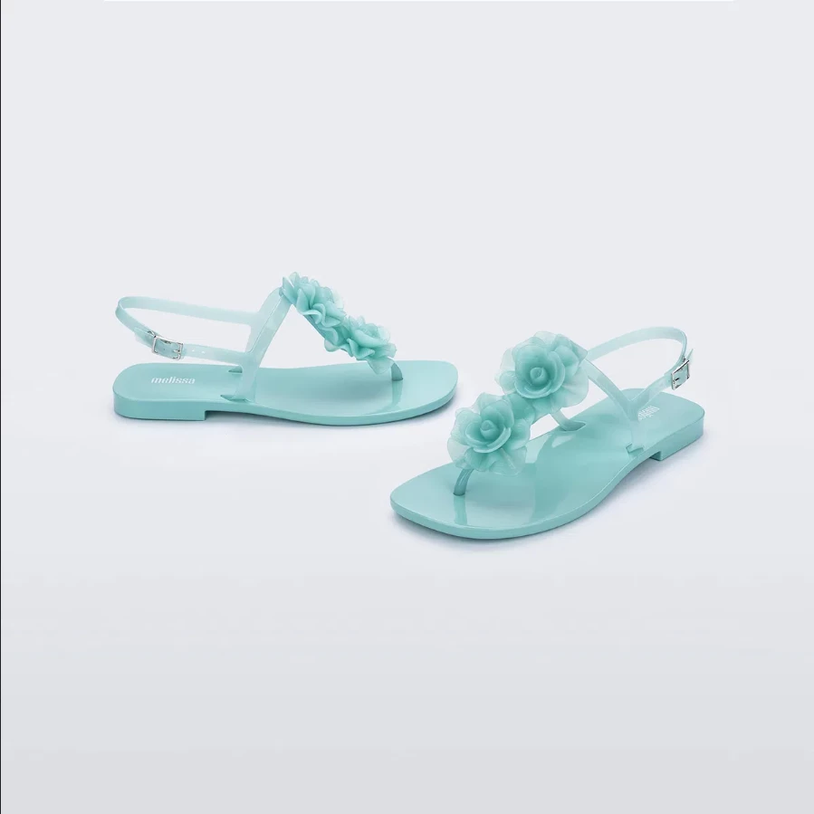 Beautiful 3D flowers are perched on a water-resistant flat made with fruit-scented PVC for a romantic design that will make your heart sing.