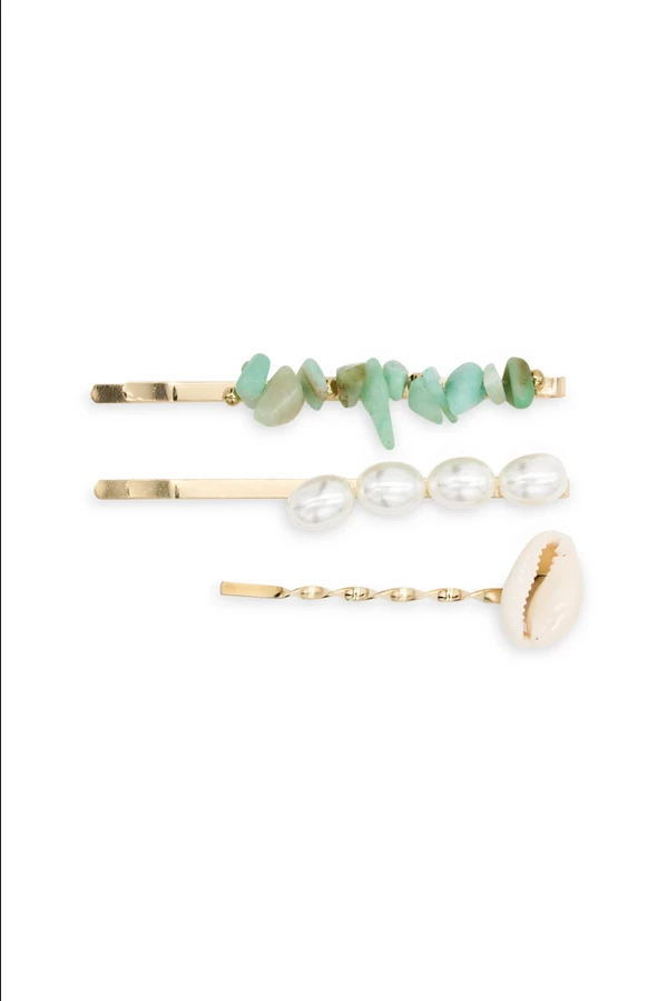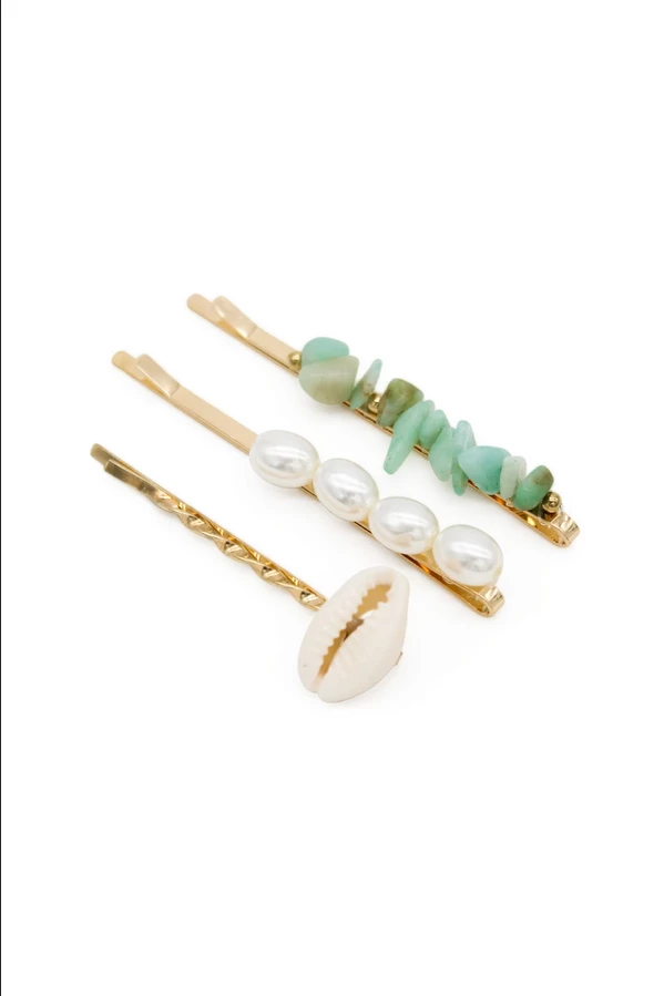 The Morgan & Taylor Ciello hair clip set, embracing the 90’s nostalgia this season featuring a set of three seashells including a puka shells and pearls