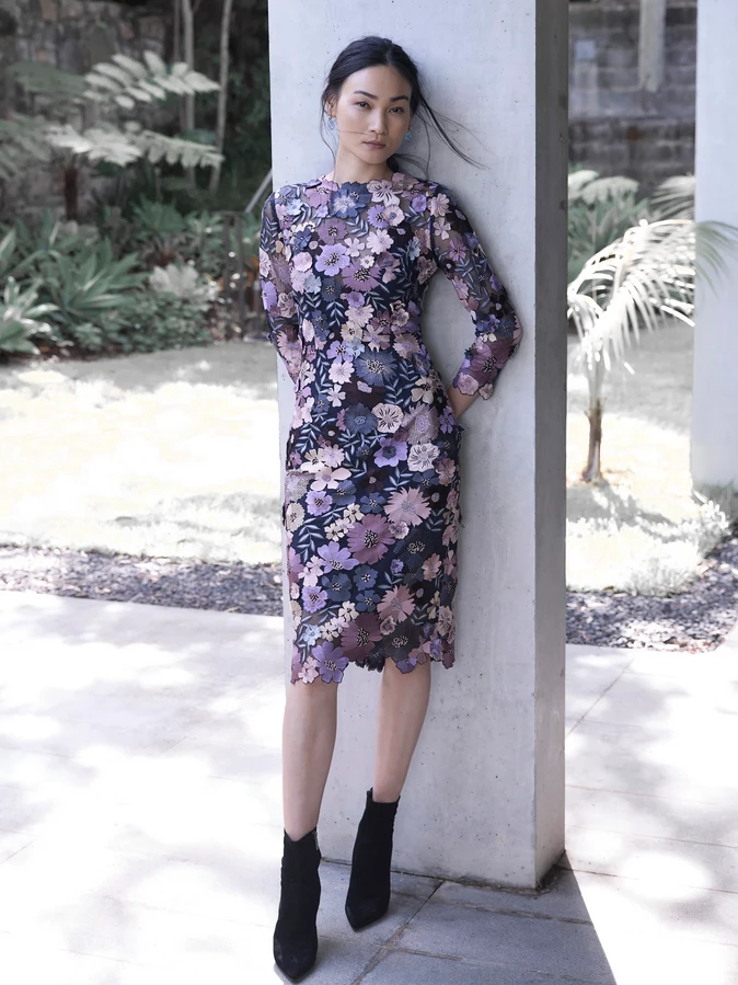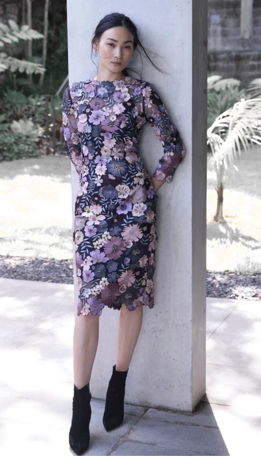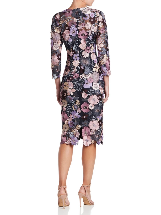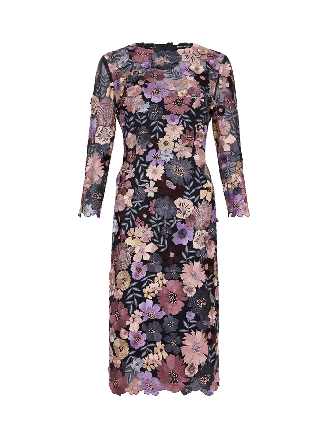 Hand embroidered; The Autumn Meadow Shift Dress is crafted on a fine tulle with delicate floral motifs and 3D flowers. It is fitted through the body, finishing on the knee and comes with a separate navy jersey slip. The intricate detailing and beautifully finished scalloped hems and neckline makes this dress perfect for those special events.