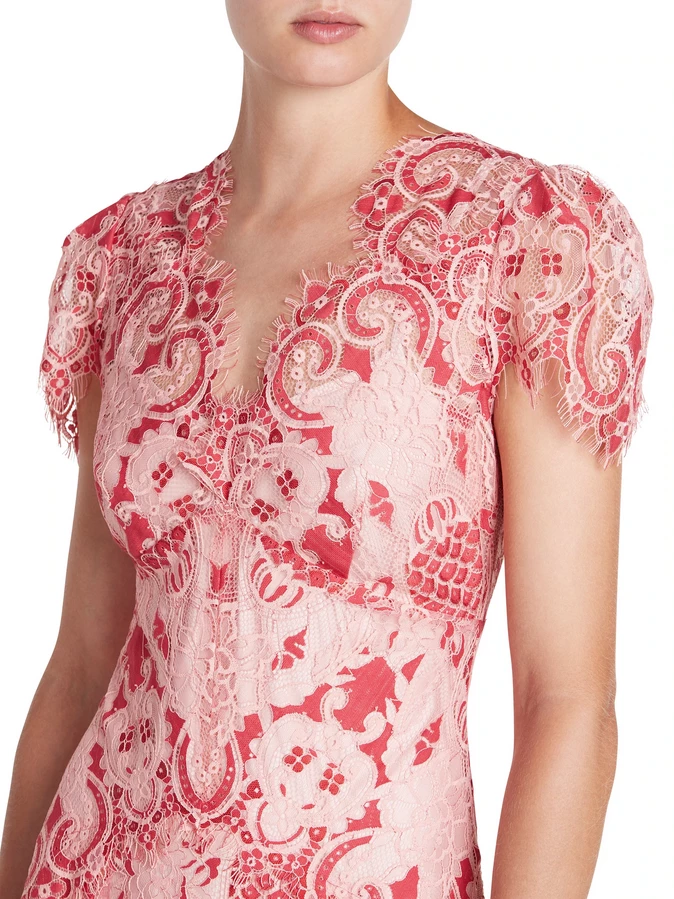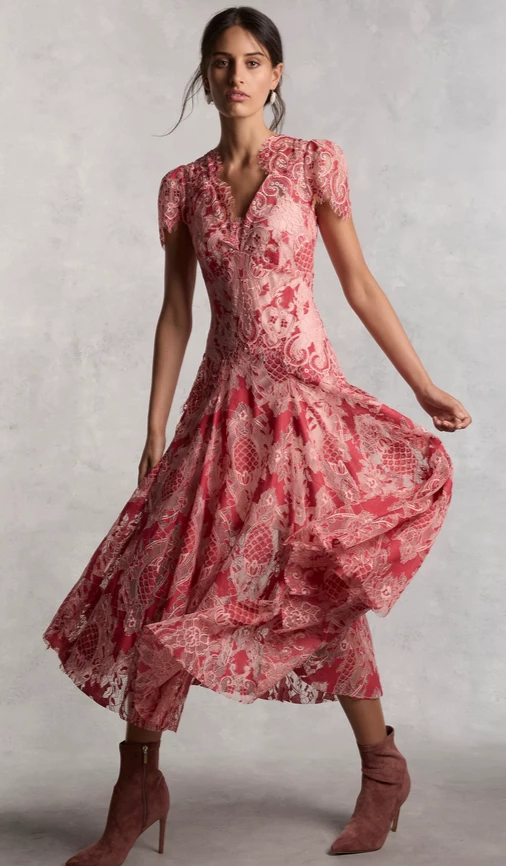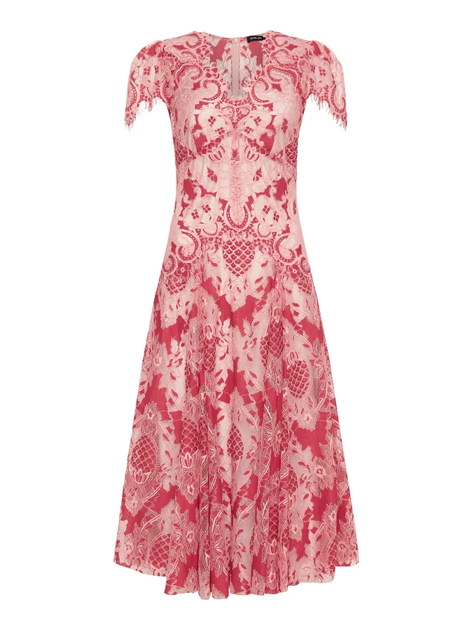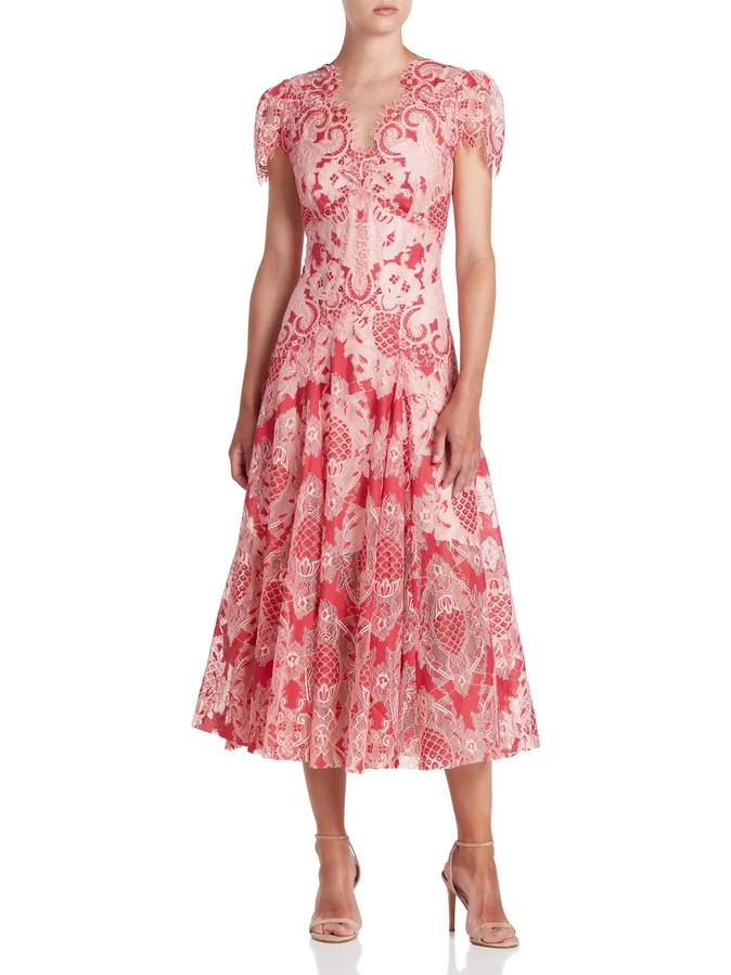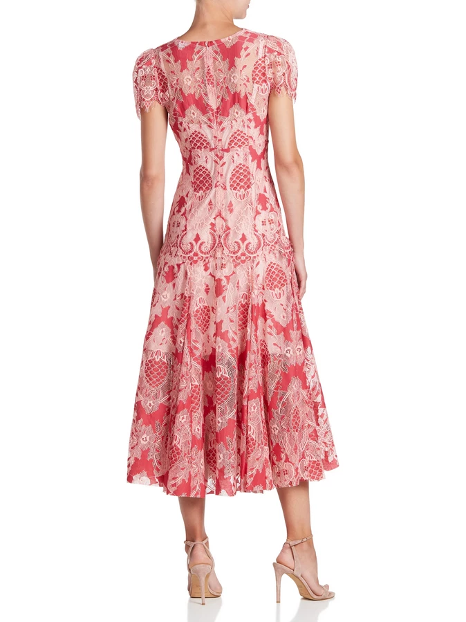 Crafted from an intricate two-tone scallop lace, the Azalea Cap Sleeve Dress is designed with an A-line silhouette, that is fitted at the bodice falling into a full flowy skirt with extra fullness created from godets, finishing mid-calf. This figure flattering silhouette features scalloped cap sleeves and a detailed scalloped lace sweetheart neckline. The delicate lace makes this the perfect dress for special occasions, style yours with nude heels.