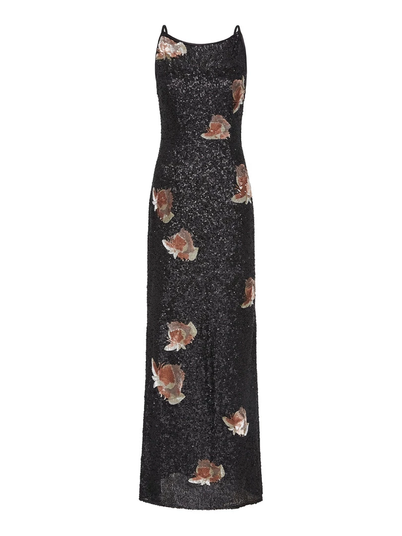 The Greta Gown is the perfect option for formal events or parties. It is crafted from stretch matte black sequins featuring multi-tone floral motifs that catch the light so beautifully as you walk. This gown is cut with a fitted, full length silhouette and features a flattering cutaway neckline with a low back – sweep your hair up to show it off.