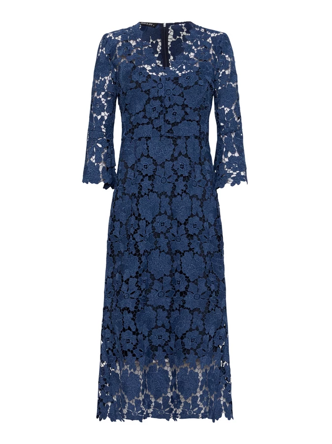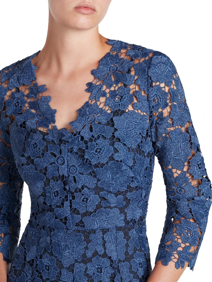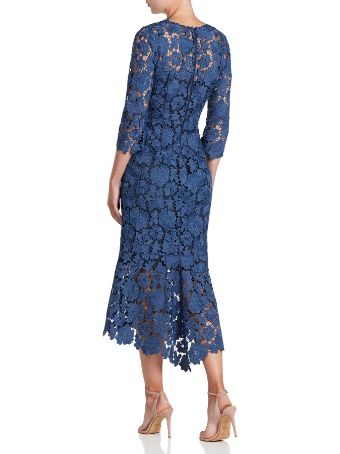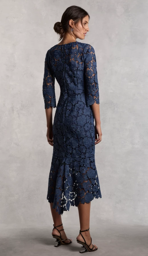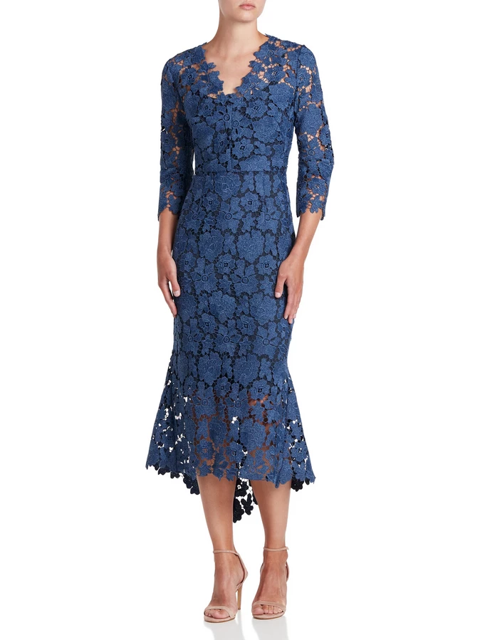 Cut from a heavy two-tone scalloped guipure lace, the Indigo Dress is designed to be fitted through the body with a waist seam, falling into a high low hem from the knee with a slight flounce. Featuring ¾ sleeves and a scalloped edge V-neck neckline. The structured nature of the fabric gives the dress its great shape and fit, making this the perfect silhouette for your formal events or the modern mother of the bride.