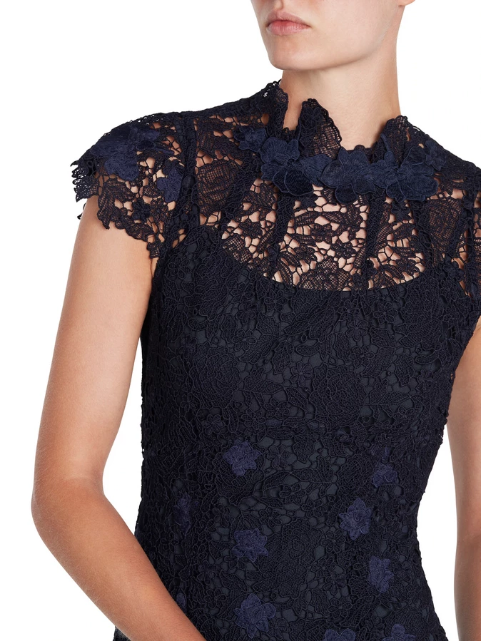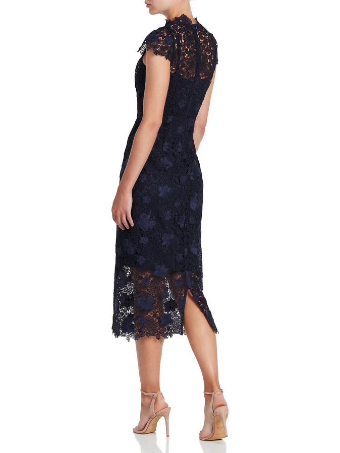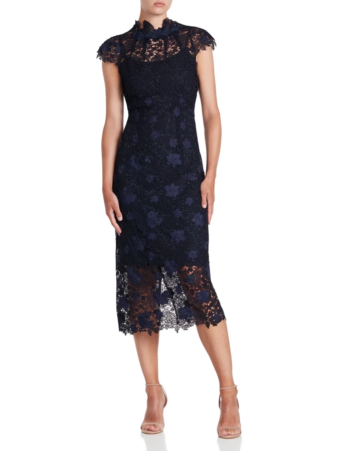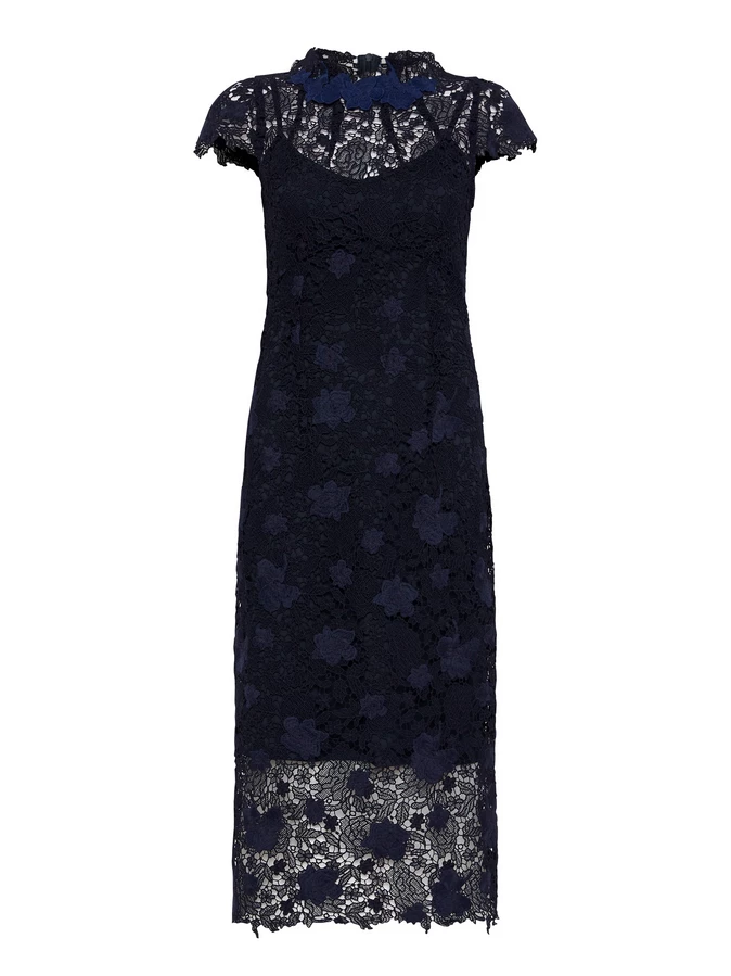 The perfect dress for your upcoming events. The Jemma Dress is crafted from a dark navy floral embroidered lace with contrasting appliquéd floral motifs across the high neck and body of the dress for added detail and texture. The elegant silhouette features a high neckline and cap sleeves. It is fitted through the body and finishes mid-calf. Style yours with heels for a complete look.
