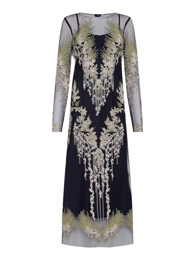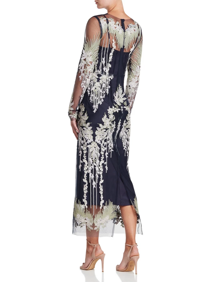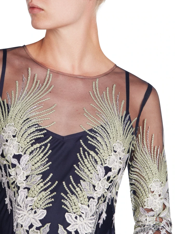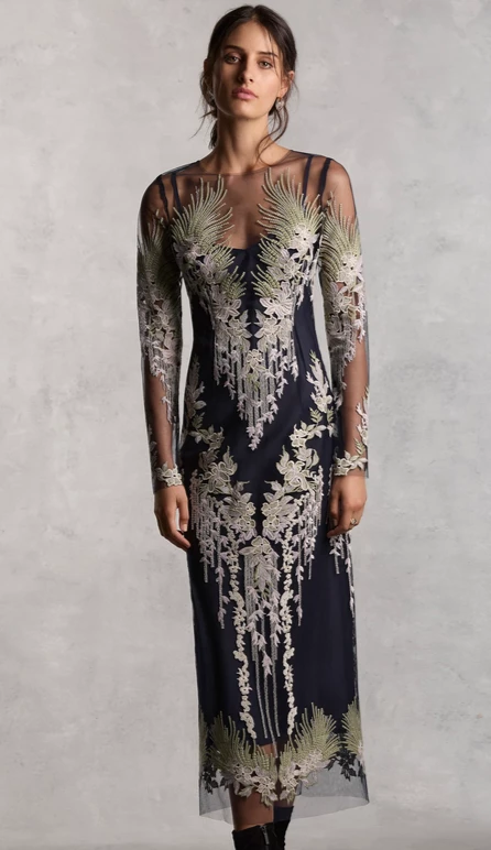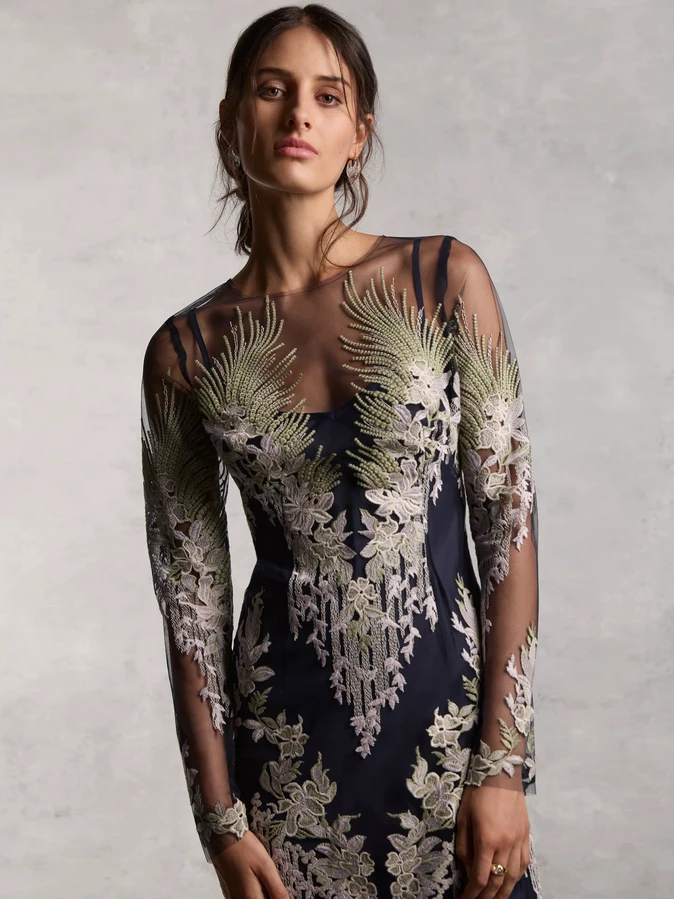 The Lavender Dress is crafted on a fine navy tulle, intricately embroidered with hints of lilac, mint and ivory. Designed to hug the body through the torso falling into a straight ankle length skirt, the shift dress features long sleeves where the embroidery details leave bare tulle on the shoulders and allow for a flattering round neckline, with a centre back split and invisible zip closure. The sheerness of the tulle alongside the placement and detail of the embroidery makes the Lavender Dress an elegant choice for all your cocktail events or the modern mother of the bride.