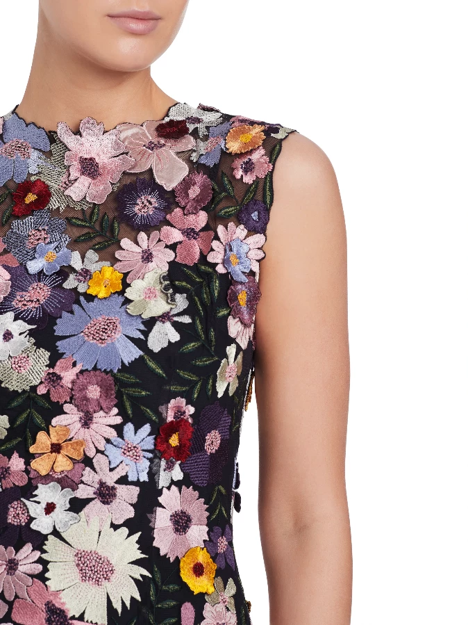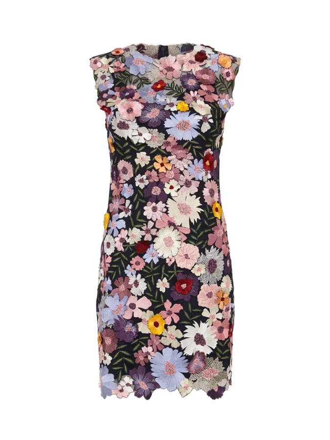 Hand embroidered; The Meadow Mini Dress is crafted on a fine tulle with delicate floral motifs and 3D flowers. It is fitted through the body, finishing mid-thigh and comes with a separate navy jersey slip. The intricate detailing and beautifully finished scalloped hems and neckline makes this dress perfect for those special events.