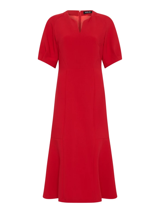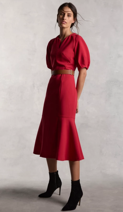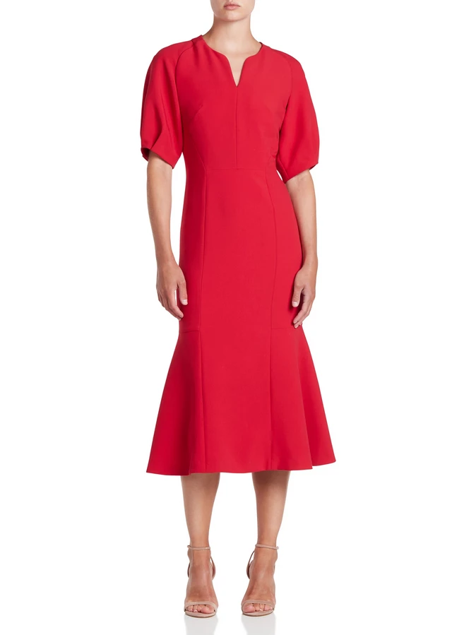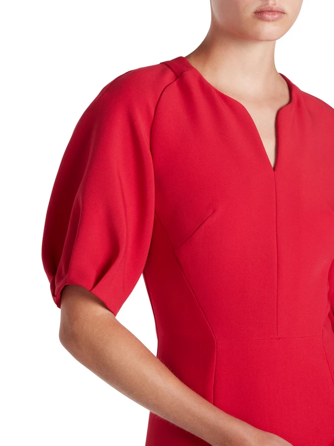 The Poppy Dress is crafted from a mid weight stretch twill suiting that flatters the natural shape of the body and features a curved sweetheart V-neck with tucked elbow length sleeves. The tailored paneling through the body falls to a flounce hem, finishing low calf. This is the perfect dress for a sophisticated conference to cocktail look.