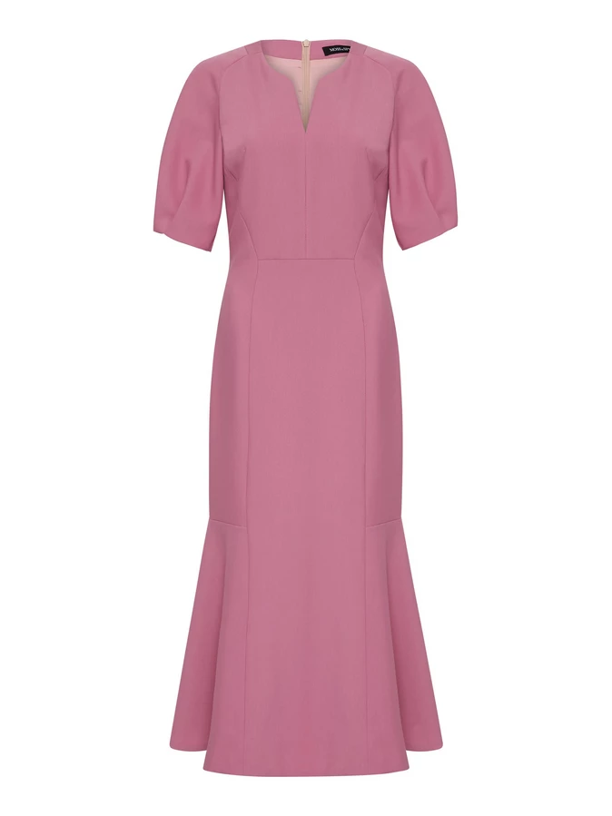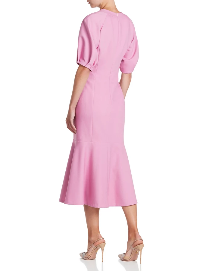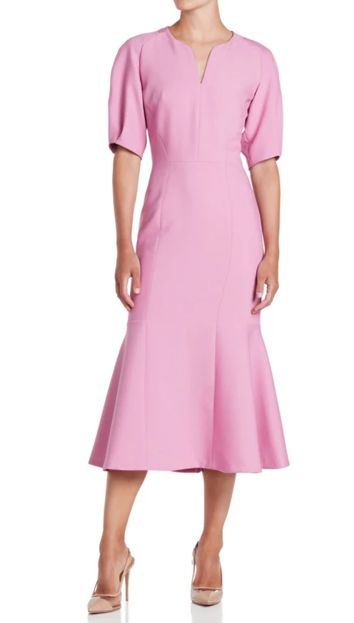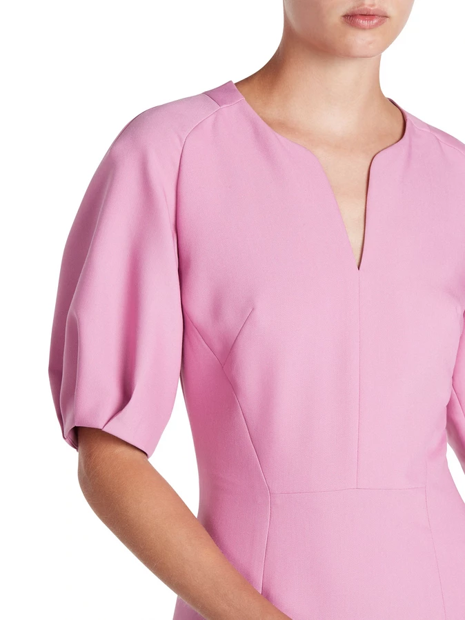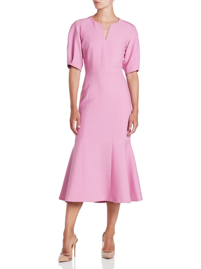 The Samantha Dress is crafted from a cotton blend stretch twill suiting that flatters the natural shape of the body and features a curved sweetheart V-neck with tucked elbow length sleeve. The tailored paneling through the body falls to a flounce hem, finishing low calf. This is the perfect dress for a sophisticated conference to cocktail look.