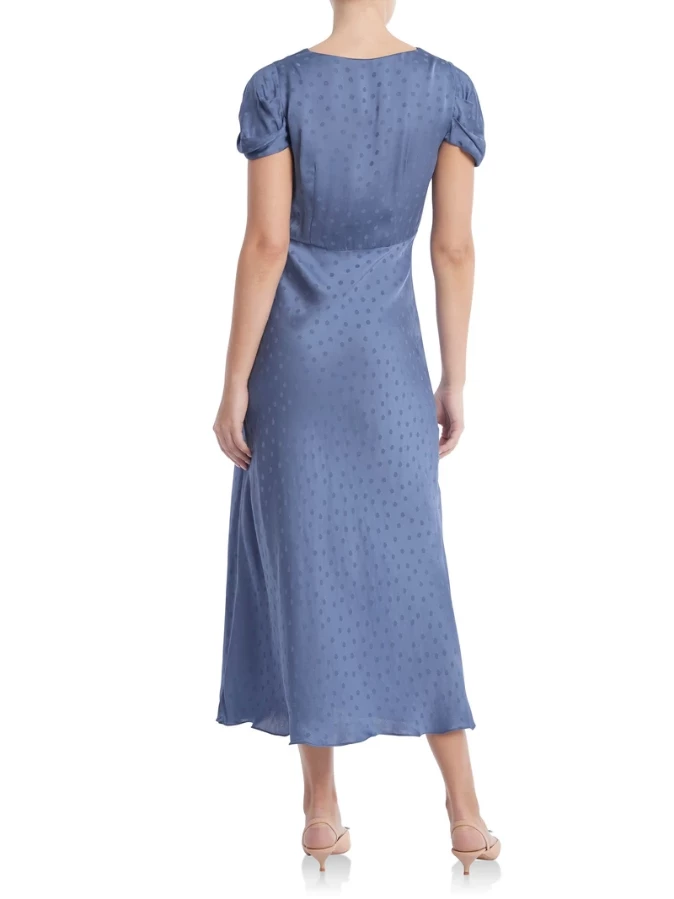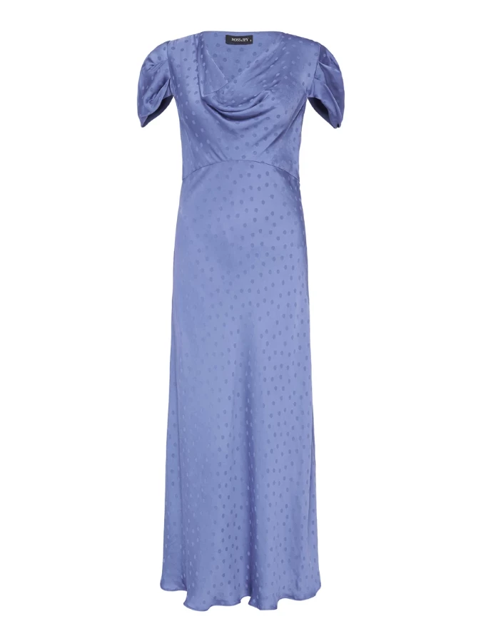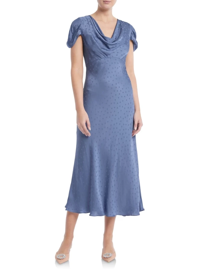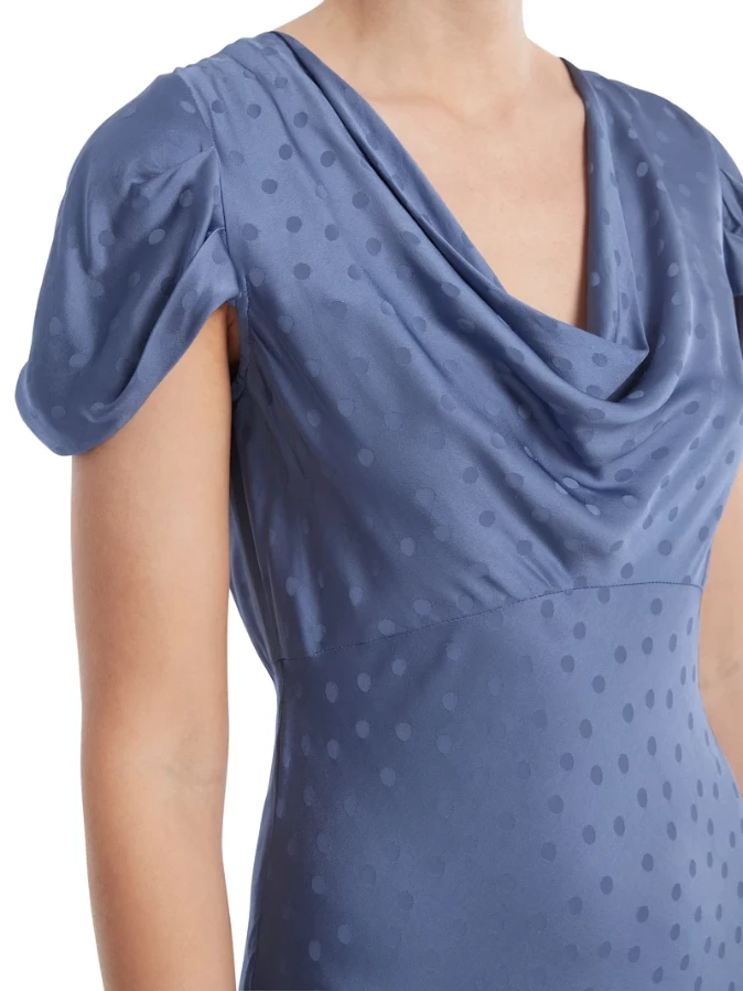 The Vivien dress is crafted from a bias-cut self spot satin crepe. This beautiful A-line silhouette features a cowl neckline and is cut on the bias to give a flattering fit with a soft drape off the body. The cap-sleeves have soft pin tucks giving an elegant look to the dress. The Vivien dress will effortlessly take you from day to night.