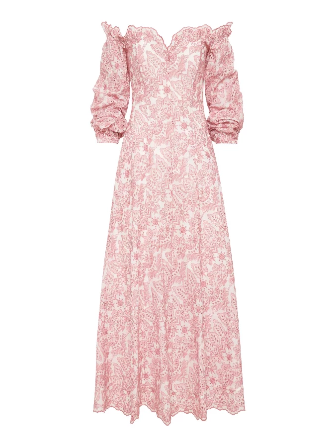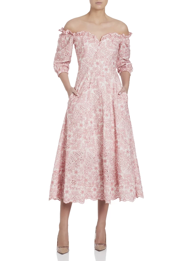 The Blossom off-the-shoulder dress, cut from an intricate ivory broderie anglaise with blush pink embroidery is perfect for summer parties. This 100 % lightweight cotton midi length dress is fitted through the bodice and nips in at the waist to create an A-line skirt. Beautifully constructed with boning in the bodice the elastic finish on the sleeve makes it easy and comfortable to wear. The detailed scallop hem and neckline takes this dress to another level.