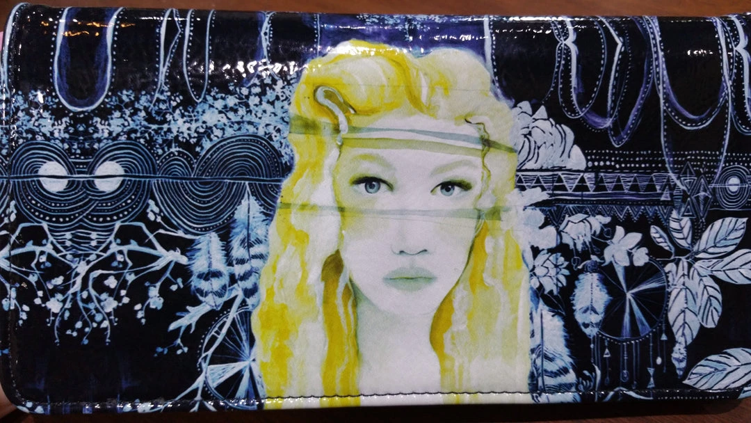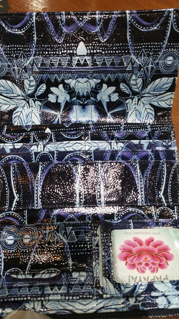 Love these gorgeous printed wallets by Papaya Art! Soft supple and strong, and simply the most gorgeous wallet ever invented. Tri-fold with ample space for cards coins and notes -200mm wide x 95mm high folds out to 320mm Oiled cloth-like material with fabulous print!