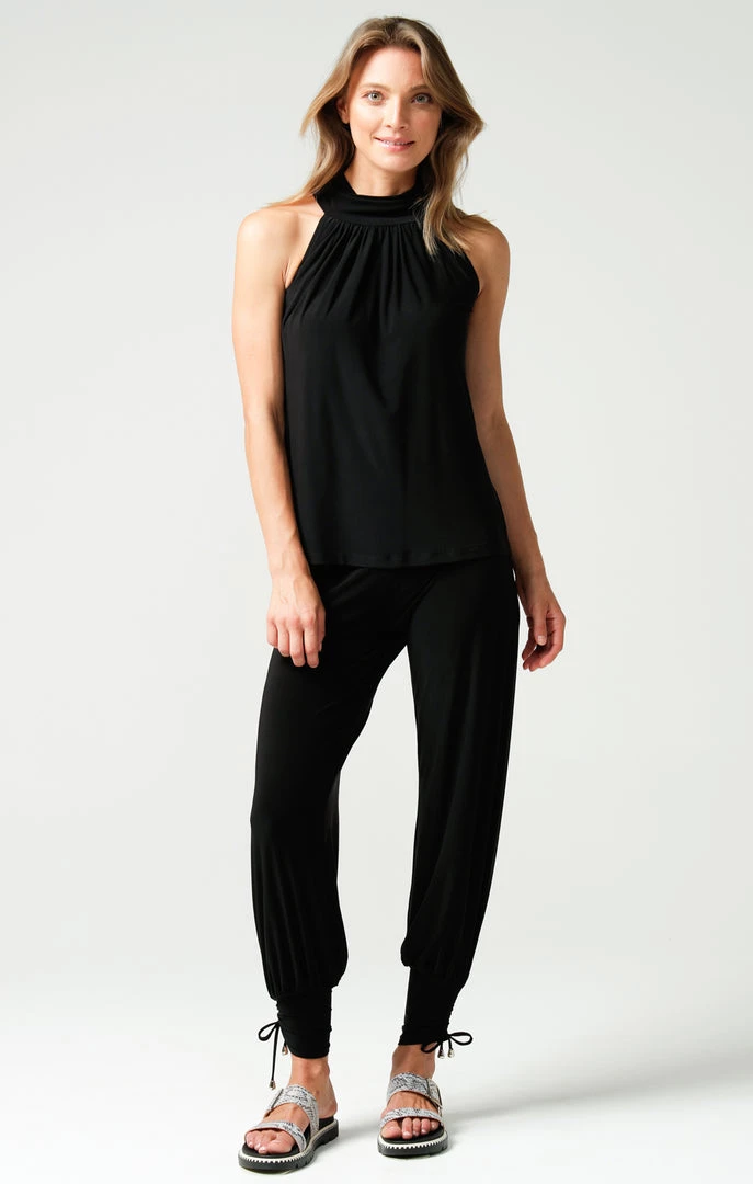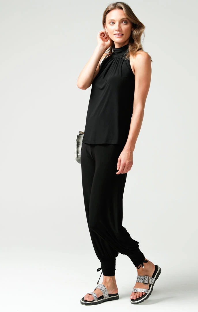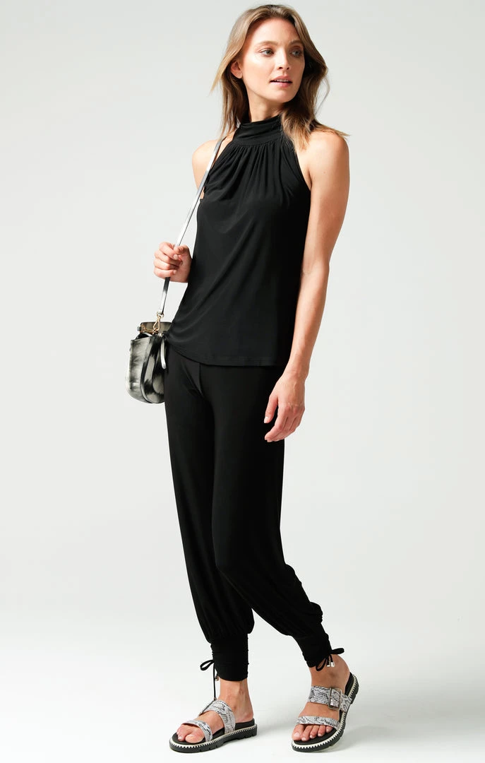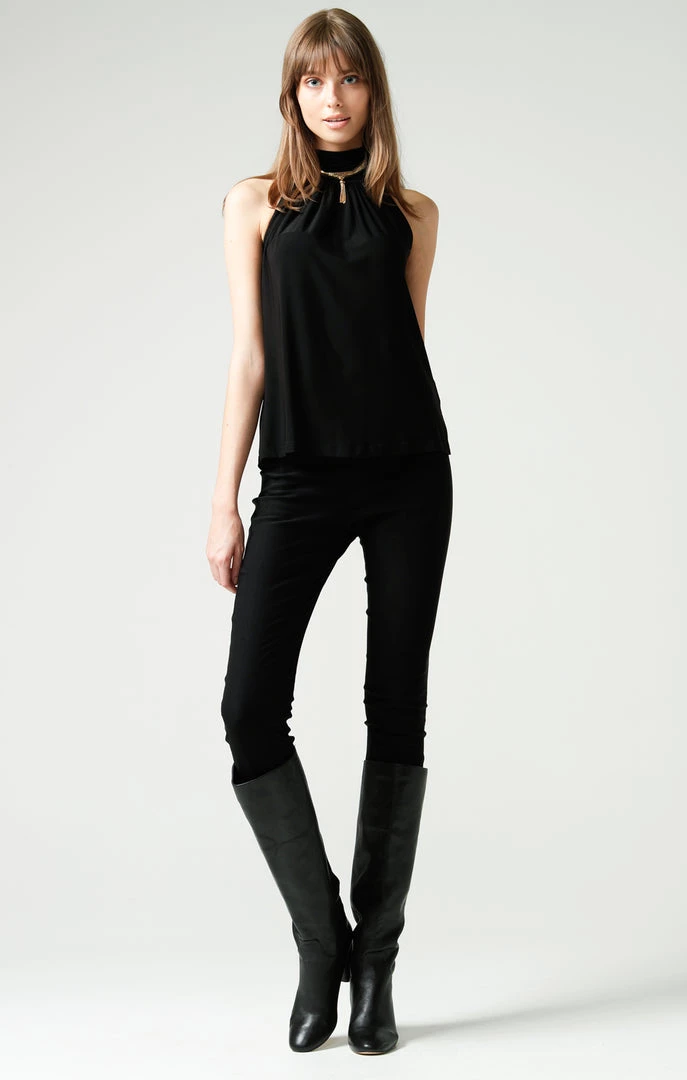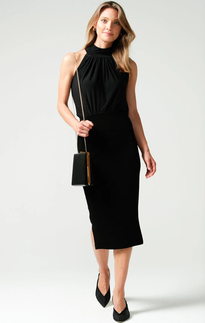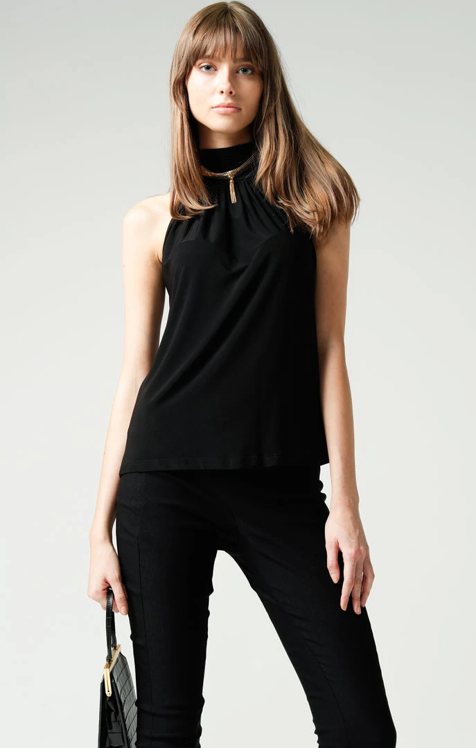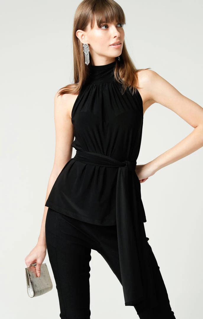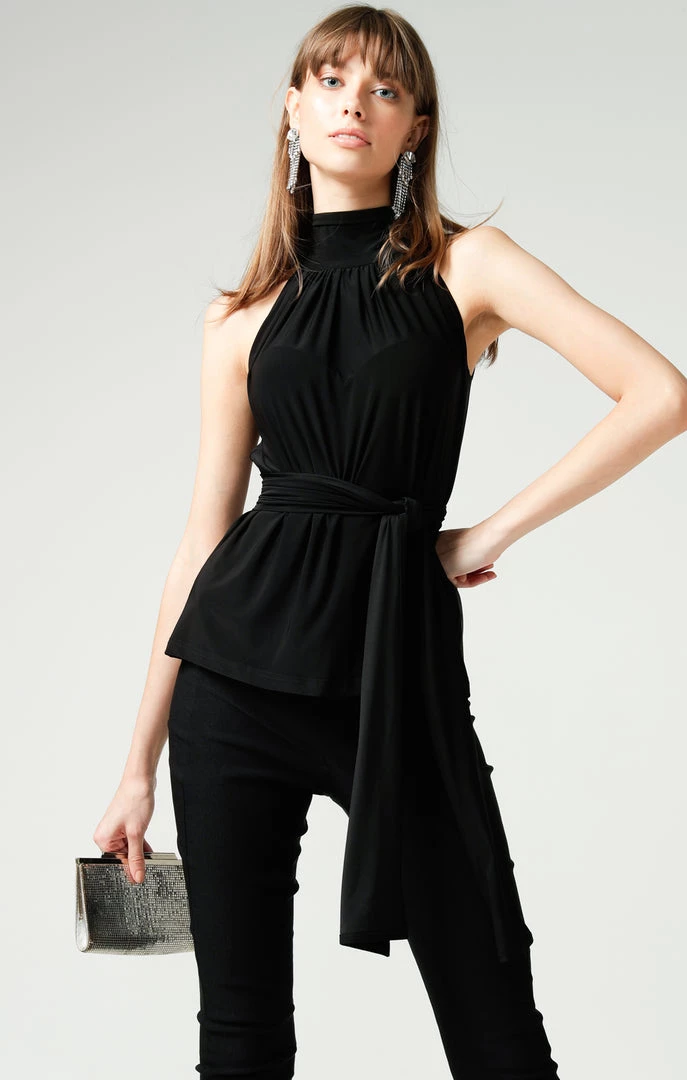 I’m a chic and comfortable stretch top and my high neckline creates a strong vertical line, slimming the body. My A-line fit is loose, but you can use my belt to create more shape through the waist which creates a peplum effect over the hip. I compliment both skirts and pants and can be worn either tucked in or out. I can be easily dressed up for evening events, cocktail parties and weddings, however I’ll also be your go to for work, travel and lunch with the girls.