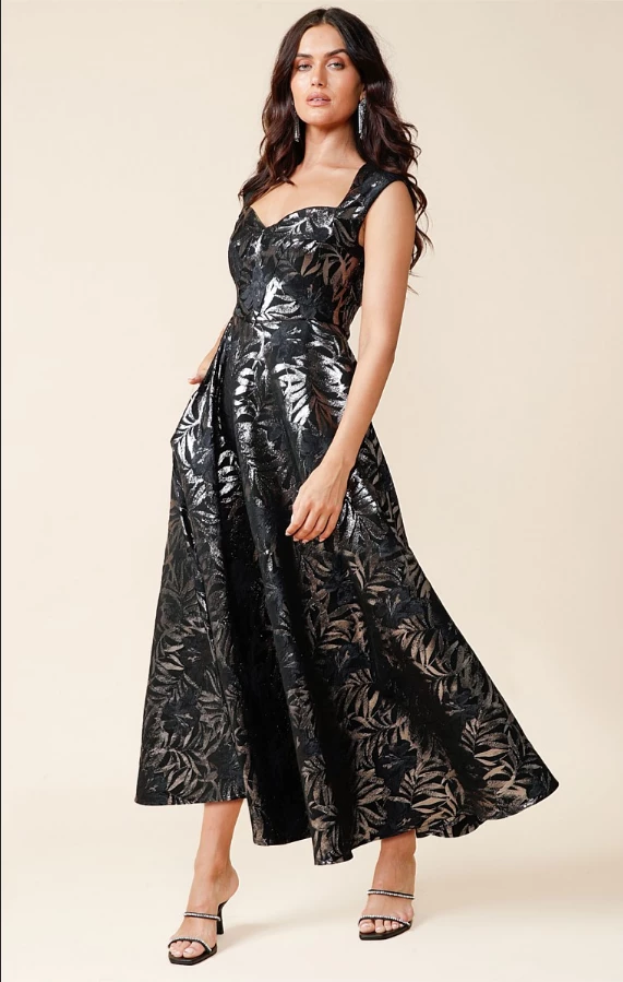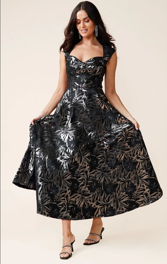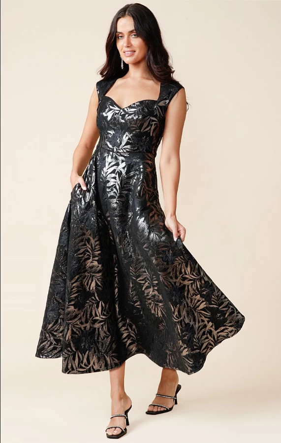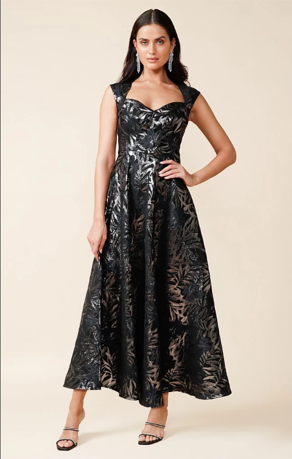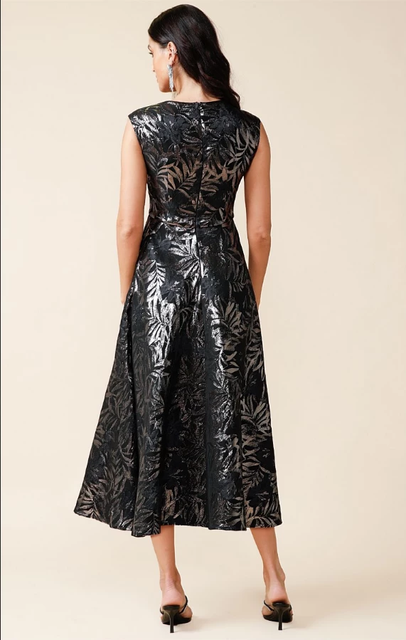 The Jasmine Dress is simply sophisticated. It’s crafted from a stretch metallic jacquard in an exclusive black navy metallic floral print, which will glimmer in the light with every twist and twirl. Showcasing a feminine neckline, mini cap sleeves and a voluminous A-line skirt made for a dramatic silhouette – perfect for your next event. Keep this eye-catching piece in focus with black heels and a pair of sparkle earrings.