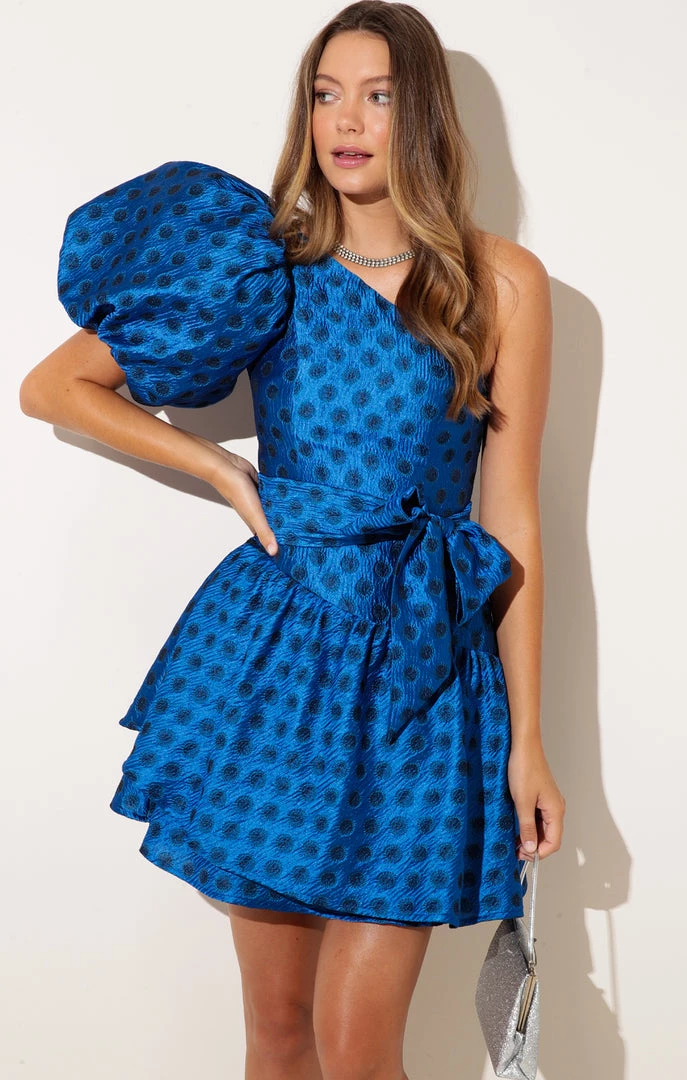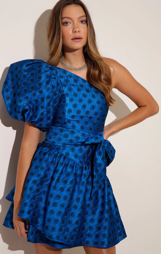 With its elegant one-shoulder design, voluminous puff sleeve, and tiered A-line skirt, the Pavillions of the Mind Dress brings a chic yet playful spirit to our Collection. Crafted from a jacquard fabric, that is soft yet provides structure. The precision of the rich blue creates a mood where you will want to party well into the night! The structured puff sleeve adds drama whilst the bodice provides a feminine silhouette. This will look divine paired with silver accessories and a bold red lip.