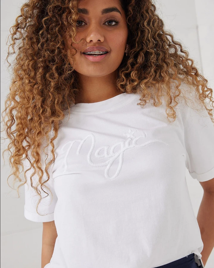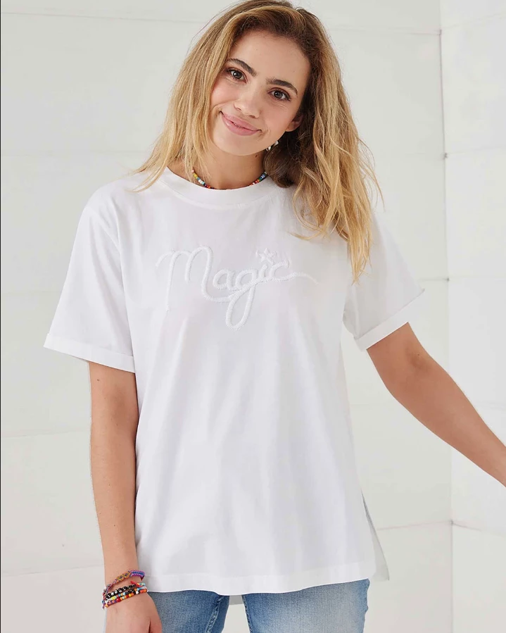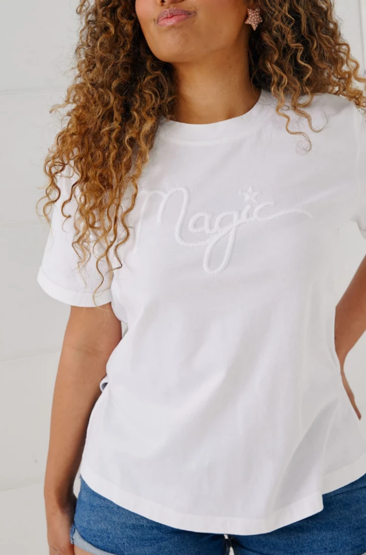 MAGIC HAPPENS. And well in 2021 alot more SH*T HAPPENS but …moving on! In the words of one of our favourites Roald Dahl “A little magic can take you a long way.” Father Christmas, Easter Bunny, The Tooth Fairy, caterpillars turning into butterflies, rainbows after rain. It’s all magical, it’s life. And what better item to enjoy each tiny special simple magical moment than a perfectly cut, crisp white cotton tee, with beautiful chunky wool M A G I C A L embroidery, from Binny.