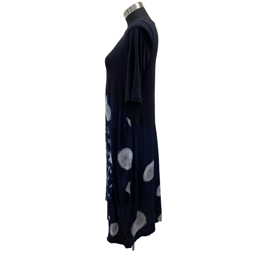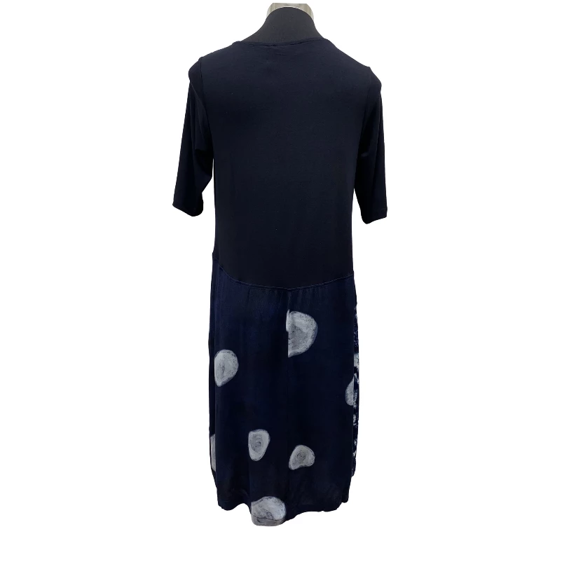This dress has simple and clean lines with a flattering knitted fitted bodice. Perfect to wear as is or dress her up with your favourite accessories. Slips on over the head and has the ideal side seam pockets. Body of dress is in a cool non stretch viscose fabrication.