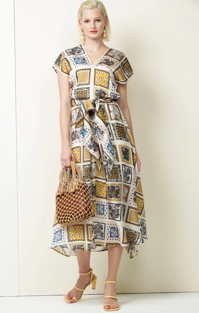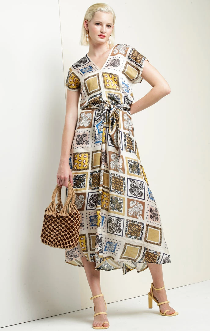 From lunch with the ladies to that special event, the Hey-Day Midi Dress will have you covered. This style features a a gorgeous mustard scarf print with a flowy A-line skirt to flatter the hips in a lightweight fabric that will float with every step. Style it your way with the decorative belt or the scarf around the waist. You can be creative and tie the scarf belt around the neck or even in your hair! For added elegance style back with strappy heels and a tan clutch.
