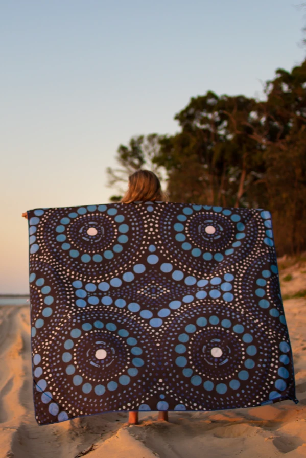 This is the X-Large version of our collaboration with Australian Contemporary Indigenous artist Saltwater Dreamtime. Truely a hand painted masterpiece on a towel, the artwork is a mixture of traditional blue and green dot-work for those earth and water lovers.