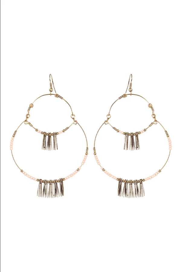 These designer inspired earrings feature round layered hoops with glass beads and multiple metal diamond shapes that dangle and dance in the summer breeze. The perfect complement to your boho summer style. Wear them with any of our maxi length dresses or skirts and you’ll feel like a mermaid gliding through summer.