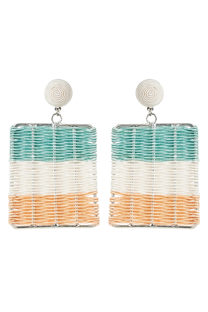Set the tone of Summer with the Palm Earring. Available in beautiful soft hues, these women’s earrings have been crafted from cane wood, iron, and brass metal, and raffia. Gorgeous square with Raffia stripes.
