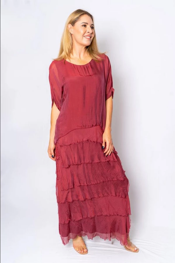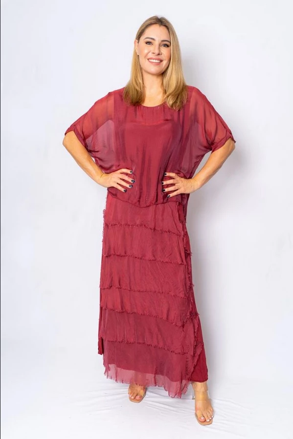 The Italian Closet – Wine Rowena Silk Tunic Dress with Cut Silk Skirt 2388N