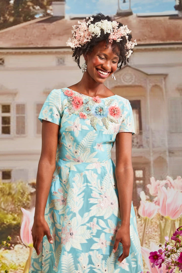 An all-time favourite, the ‘Marilyn Monrose’ dress is a wardrobe staple for event season! Designed in the gorgeous organza jacquard ‘Beyond Be-Leaf’ fabric. Featuring a bateau neckline, short sleeve and slim fit bodice, with a beautiful full skirt that falls from the waist, this dress will have you wanting to twirl!
