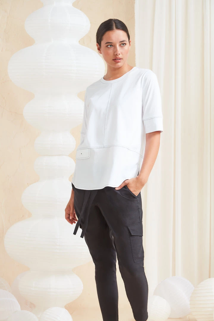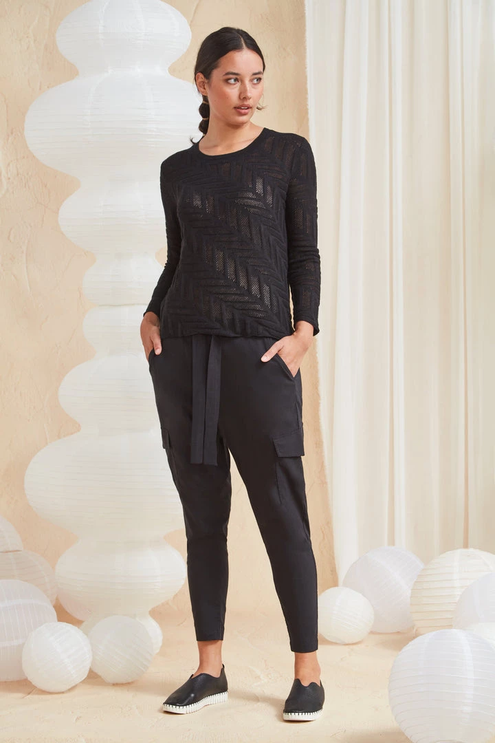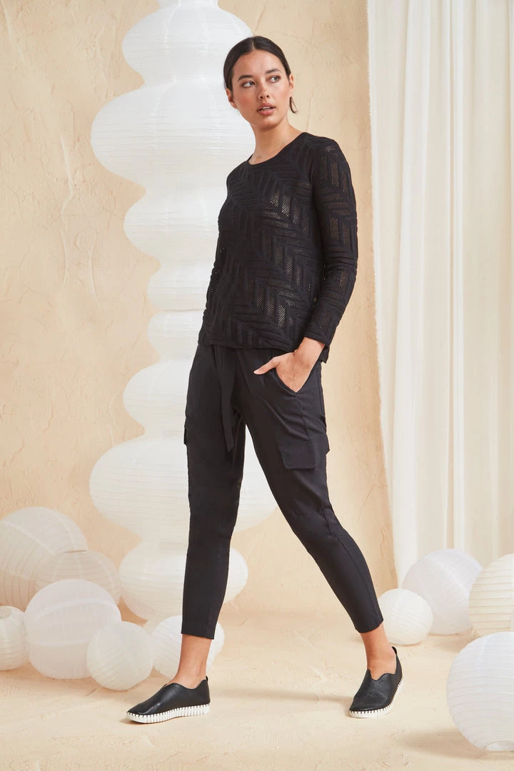 Our latest new contemporary styled Acrobat pant. Soft elastic waistband with relaxed fit through the hip and thigh and tapered through the lower leg. The Acrobat soft cargo pant features side pocket detail on each leg and has angled pockets at the hip. Falls to the ankle.